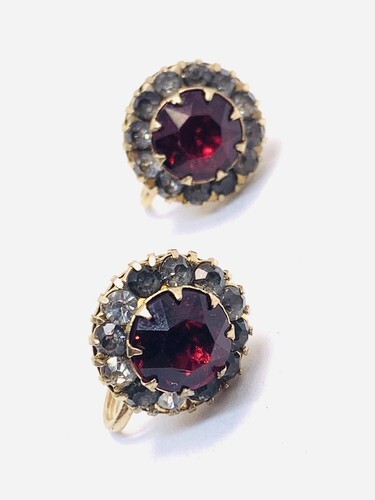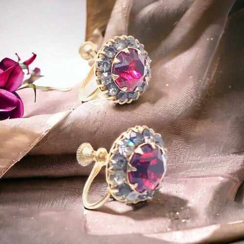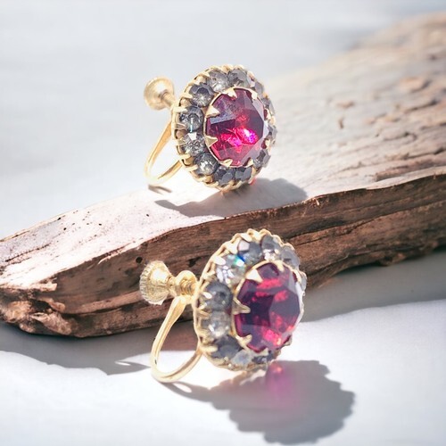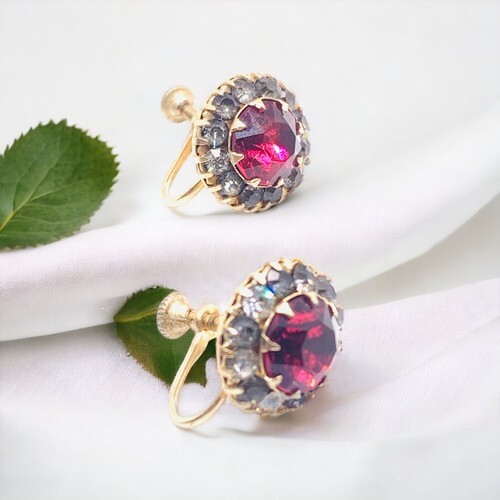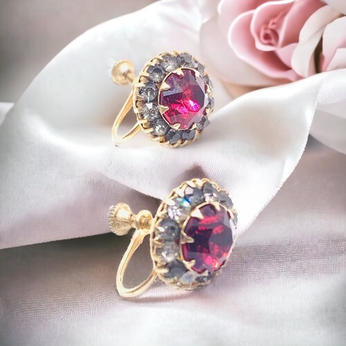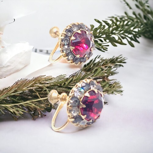 Art Deco Prong Ruby Red Rhinestone Screwback Earrings.