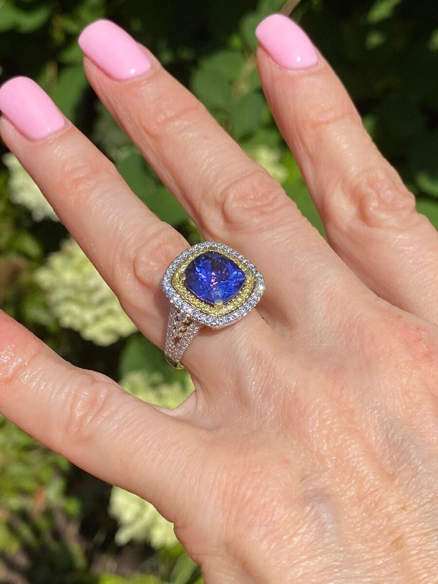 Art Deco Design Engagement Ring verfügt über einen GIA -zertifizierten 4,71 -Karat Blauelviolett -Kissen brillanten Schnitt Tansanit, der von einem doppelten Halo aus farblosen und gelben runden brillanten, geschnittenen natürlichen Diamanten in Mikro -Pave -Umgebung umgeben ist. Zusatzliche Diamanten saumen den geteilten Schaft, der die schimmernde Eleganz dieses Rings abschließt !! Der Ring wird mit einem Gewicht von 14 Karat zwei Tonen gefertigt, das mit einem hohen polnischen Finish leuchtet. Das Gesamtkaratgewicht betragt 5,60 Karat. Der Ring wird mit dem Gemological Institute of America Certificate (GIA) geliefert. Unsere Produkte sind alle von Qualitat und Pflege im Herzen des Diamond District in der 47th Street in New York City hergestellt. Unser Engagement und unser Engagement für