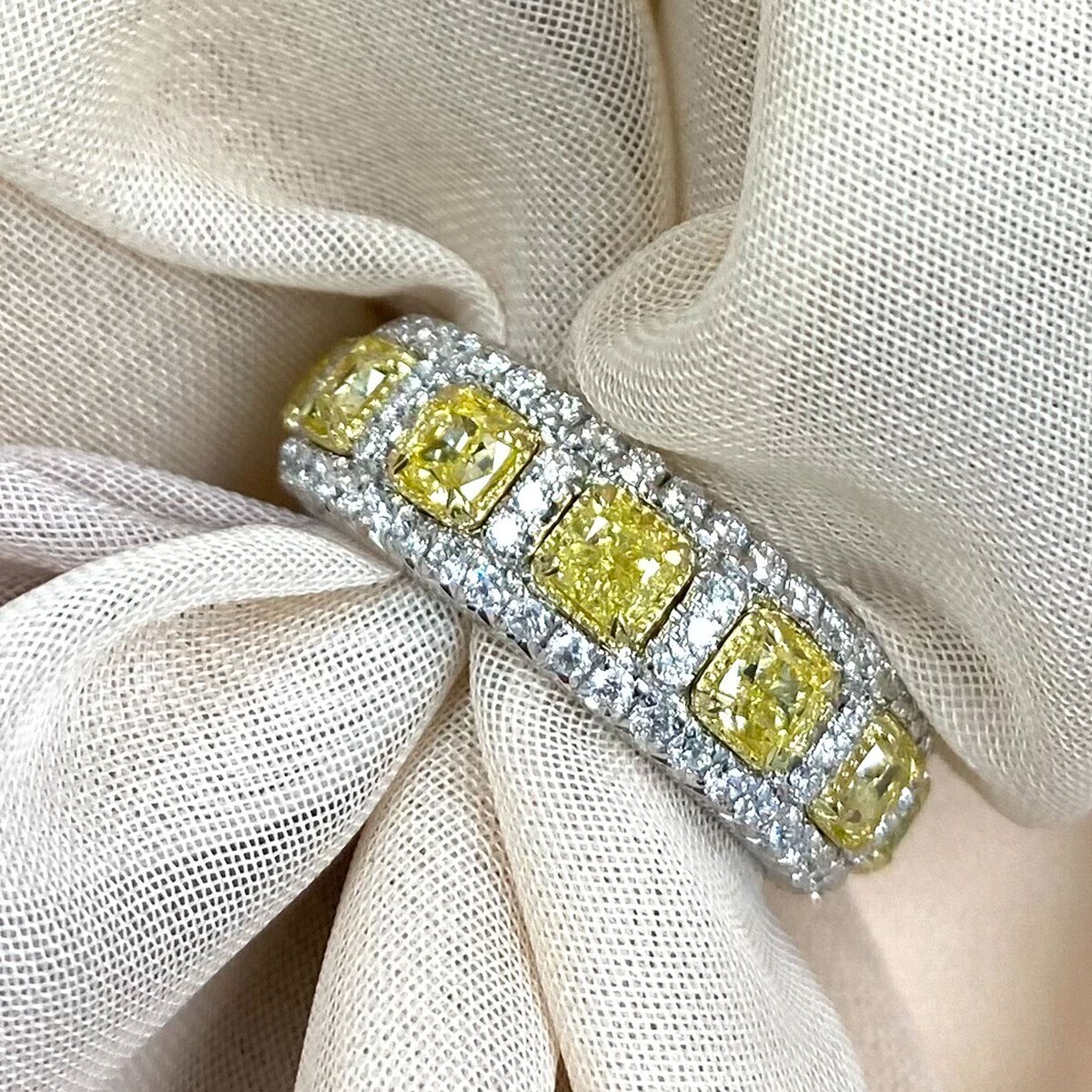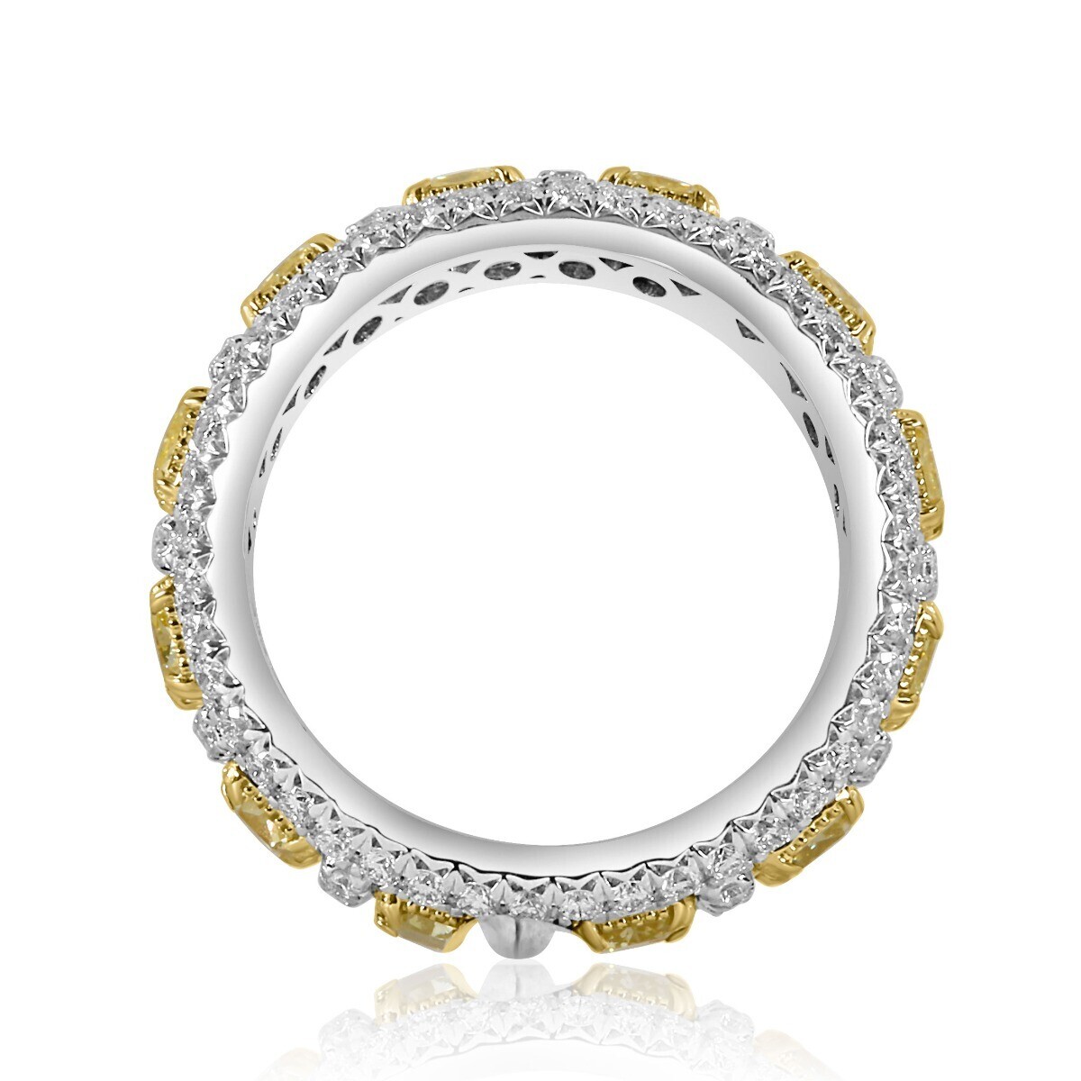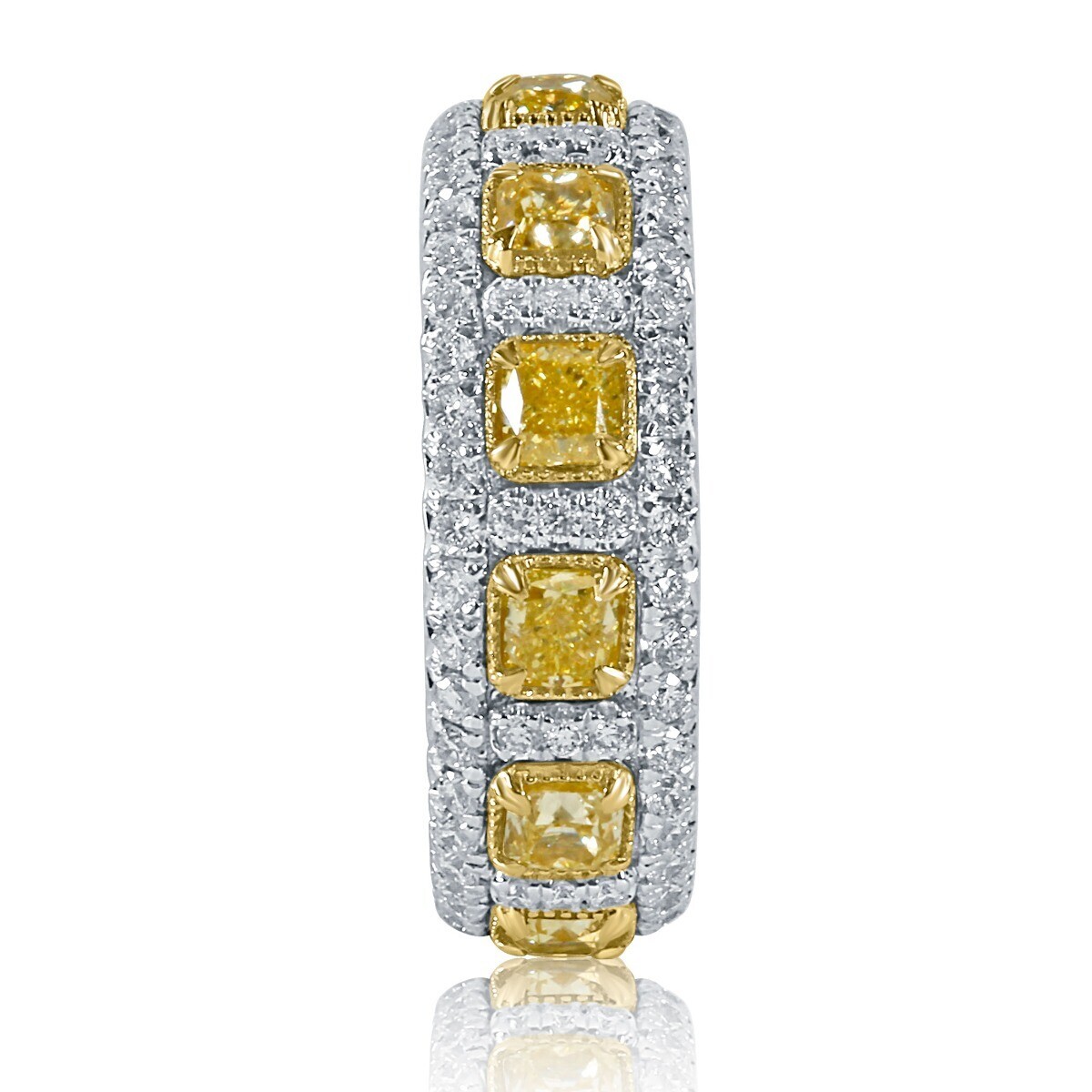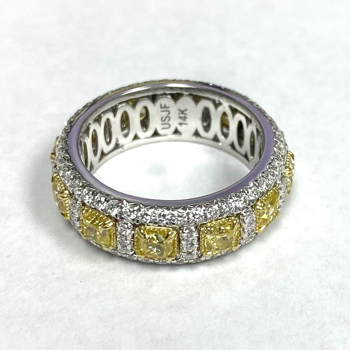 ¡¡Una espectacular alianza de boda única agregara magia a un momento especial!! Esta alianza de boda de eternidad con diseño art deco cuenta con 12 diamantes amarillos naturales de talla cojín con bordes individuales en un halo de micro pave incoloro. Hecho a mano en oro blanco y amarillo de 14k y completado con un alto pulido. El peso total en quilates es de 4,01 quilates. ¡Este es un regalo increíble para tu encantador!