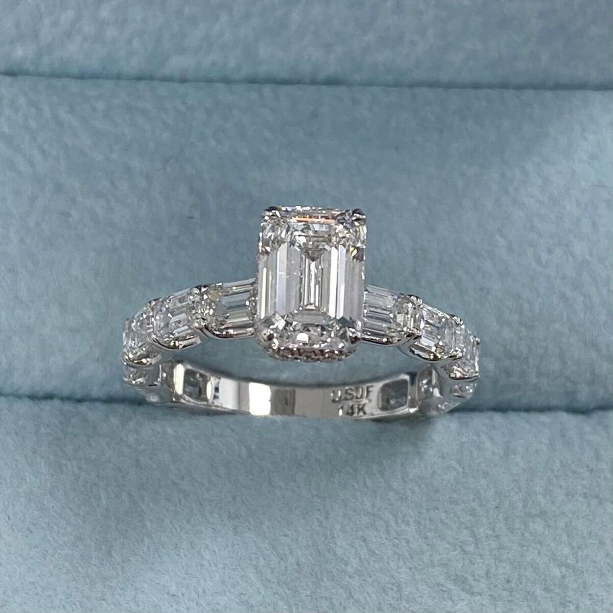 Los diamantes cultivados en laboratorio son diamantes creados en un entorno de laboratorio en lugar de extraerse de la tierra. Tienen las mismas propiedades físicas, químicas y opticas que los diamantes naturales, pero son típicamente mas asequibles. Un diamante de corte esmeralda es un diamante rectangular o de forma cuadrada con esquinas recortadas. La configuracion de oro blanco de 14k indica que el anillo esta hecho de oro blanco de 14 quilates
