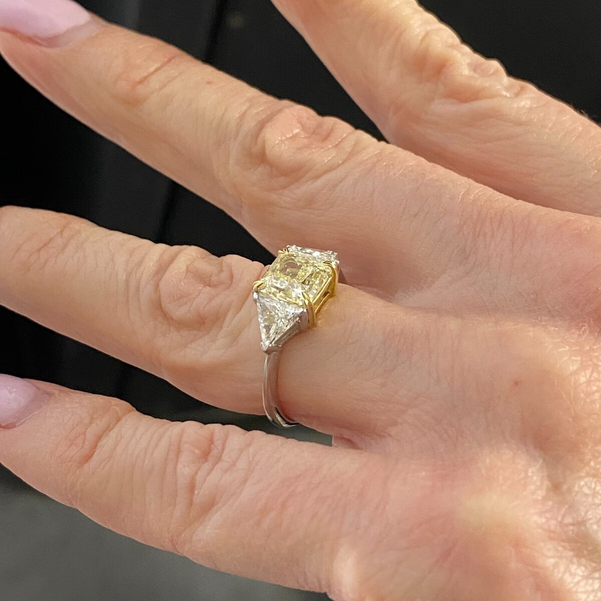 Bague de fiancailles en diamant taille radiant jaune clair GIA 2,85 TCW a 3 pierres, or 18 carats