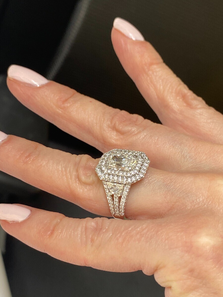 Cette superbe bague de fiancailles arbore en son centre un magnifique diamant de laboratoire taille radiant de 2,06 carats. Autour de la pierre centrale se trouve un double halo de diamants ronds cultives en laboratoire et sur le cote des milliers de milliards de diamants cultives en laboratoire, ce qui ajoute une touche de glamour et de romantisme a la bague !! Fabrique en or blanc 14 carats. Le poids total en carats est de 4,02 carats.