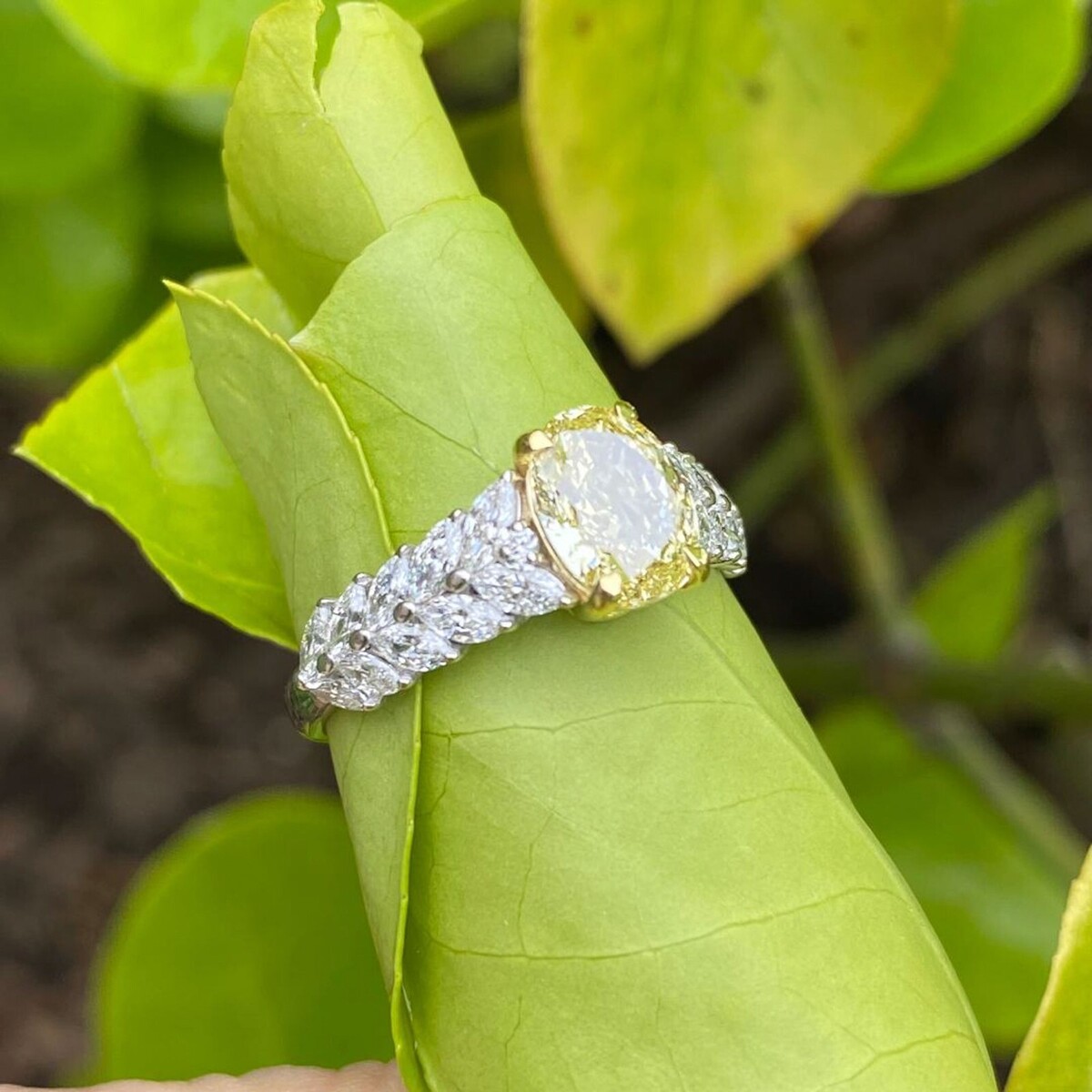 Questo squisito anello speciale e una celebrazione dell'eleganza e della raffinatezza. Al centro c'e uno splendido diamante giallo fantasia di forma ovale coltivato in laboratorio da 1,28 carati, che irradia un colore vibrante. Il centrotavola e circondato da uno splendore di diamanti taglio brillante marquise coltivati ??in laboratorio, che creano un'aura di brillantezza e profondita. Realizzato in oro bianco 14k e oro giallo 18k, questo anello combina magnificamente il design classico con l'innovazione moderna, rendendolo una scelta perfetta per coloro che apprezzano la bellezza senza tempo con un tocco contemporaneo. Il peso in carati totale e di 2,14 carati. I nostri prodotti sono tutti realizzati a mano con qualita e cura, nel cuore del quartiere dei diamanti sulla 47esima Strada a Ne