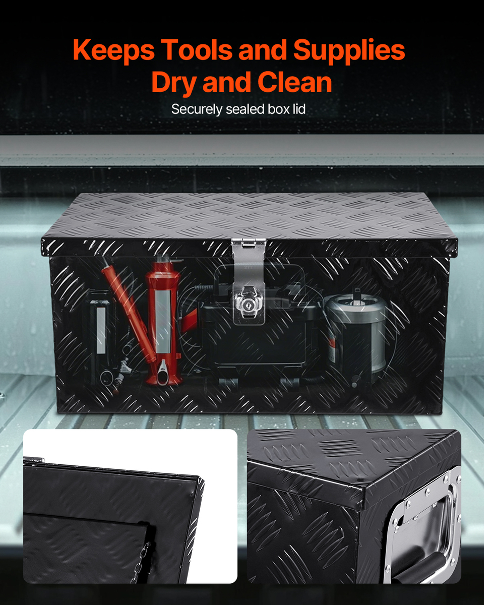 Waterproof and Corrosion-Resistant: The aluminum tool box lid features folded edges and an inner groove design, ensuring a tight seal that blocks rain and dust from entering. This keeps your tools dry even during heavy rain or dusty conditions