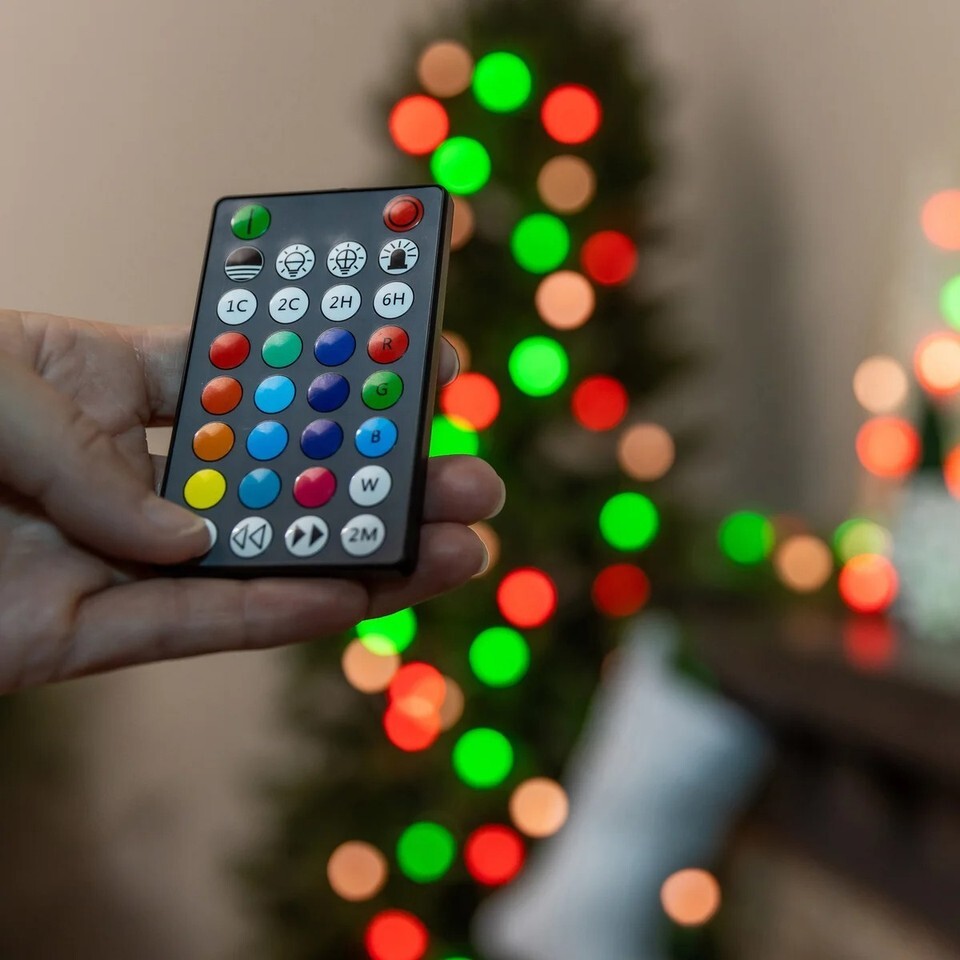 The 22 modes feature colorful effects with adjustable speeds that flow, fade and more by combining 17 single-color options. Two included IR remotes put everything at your fingertips, including selecting two countdown options. Two flexible 9,14 m (30 ft.) strands can be wrapped, hung or draped anywhere indoors or outdoors ? ideal for Christmas trees, deck railings, wreathes, lamp posts, pergolas, bedrooms, living rooms, nurseries, gaming desks, porches, camping and more! The 1.8 m (6 ft.) lead wire?s 5V, 2A adapter plugs into any standard outlet, and the built-in push-button controller offers alternate ON/OFF and mode selection.