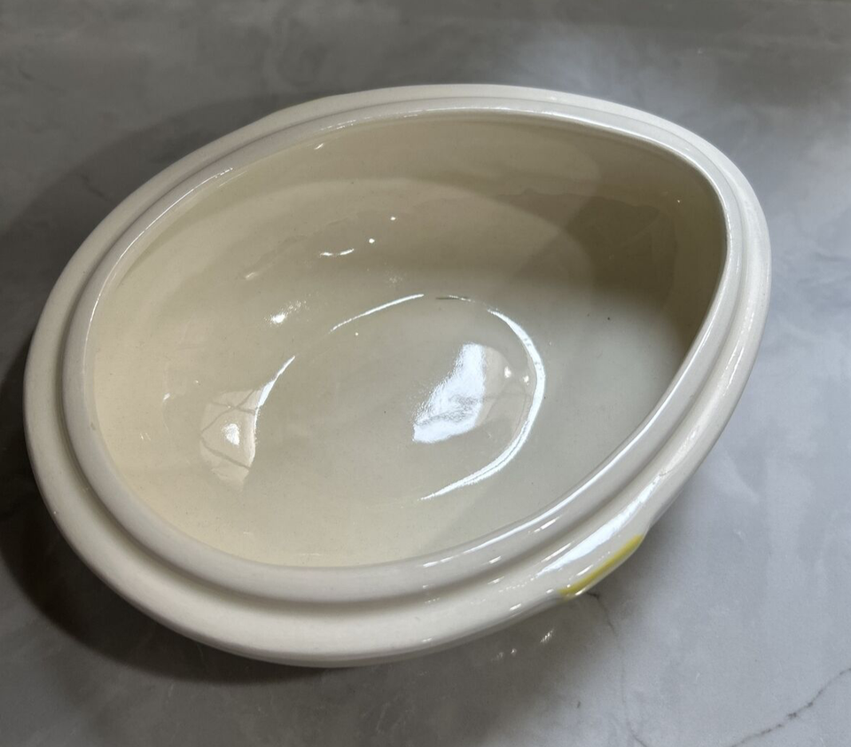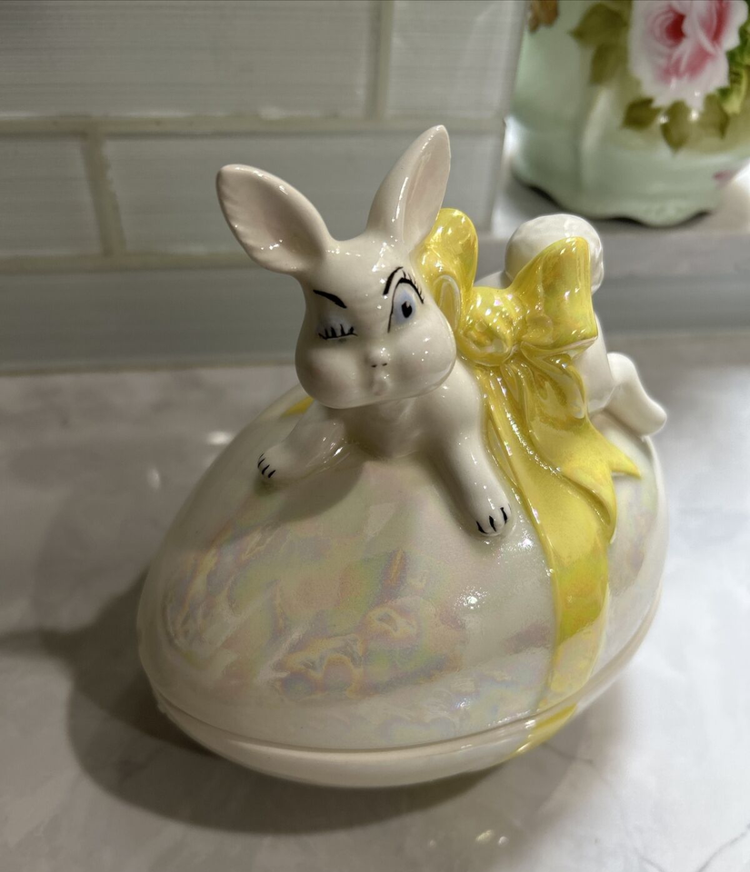 VINTAGE 1970's Egg Shaped Ceramic Trinket Candy Dish With Yellow Bow & Rabbit
