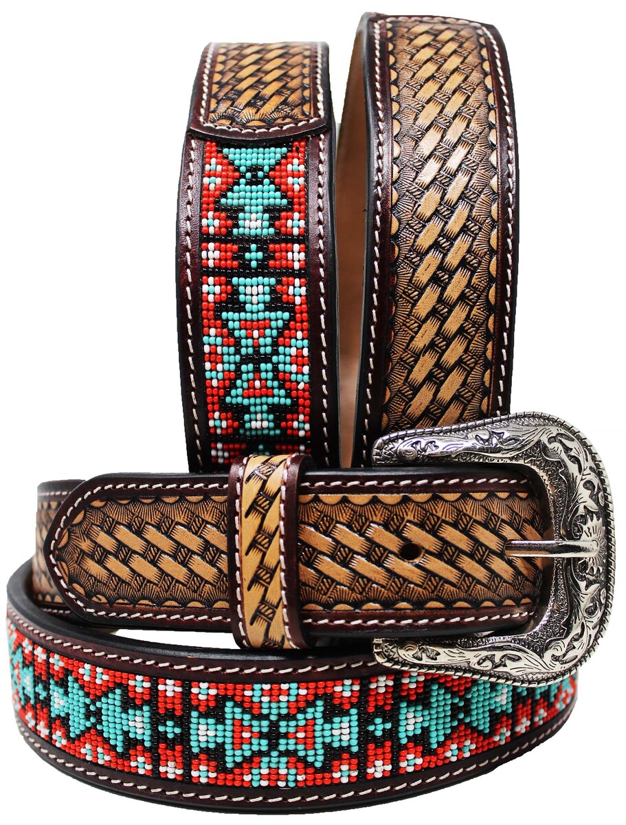 Western Antique Basket Weave Tooled Beaded Full-Grain Leather Belt 26FK54