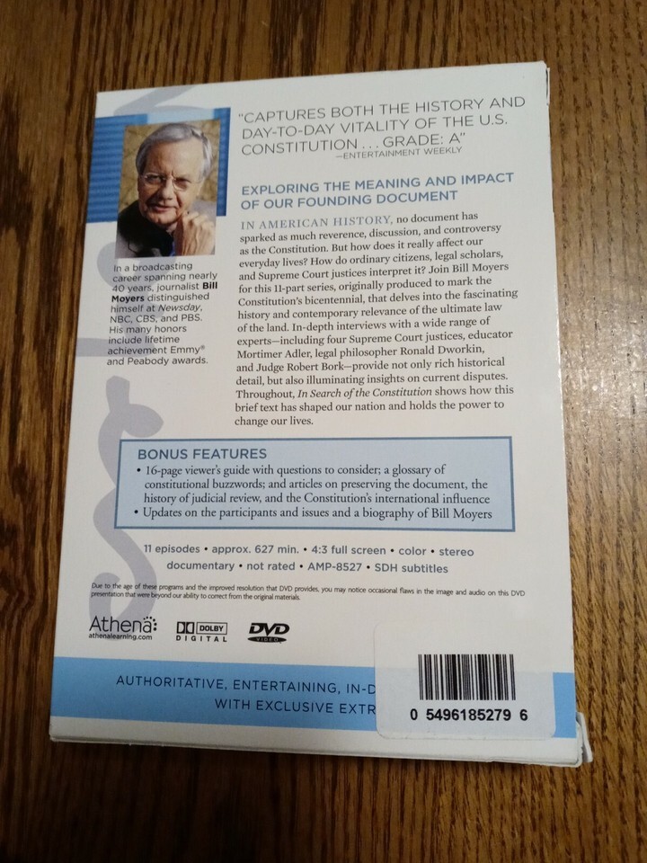 Bill Moyers: In Search of the Constitution DVD, 2011, 4-Disc Set. Condition is "Very Good". Shipped with USPS First Class.Very Good Condition ; Condition is Used-See Pictures Attached For Exact Condition . Shipped with USPS First Class Mail . You Will Receive 1 ea DVD as shown in pictures attached. SHIPS N 24 HOURS Packed By Our Award Winning Packaging And Shipping Department Long Time E-commerce Seller For Over 20 Years LIMITED AVAILABILITY THANK YOU FOR SUPPORTING OUR FAMILY OWNED USA BUSINESS Collectible Very Good Condition DVD ( DVD And Case Has Wear See Pictures Attached For Exact Description) - DVD's Are Tested And Cleaned With Our Professional DVD Cleaning Equipment Before Shipped - Ships Immediately - Great Product at a Unbelievable Price - Your Chance To Own This Collectible DVD Before Its Gone. Inventory Box #6281