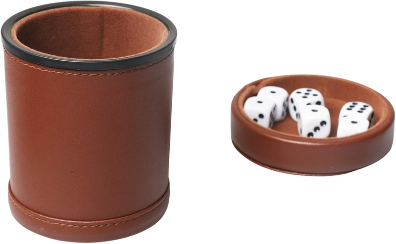 PU Leather Dice Cup Set with Lid Dark Brown Felt Lining Quiet Shaker Cup Includes 6 Dot Dice for Liars Dice Farkle Yahtzee Board Games, 1 Pack