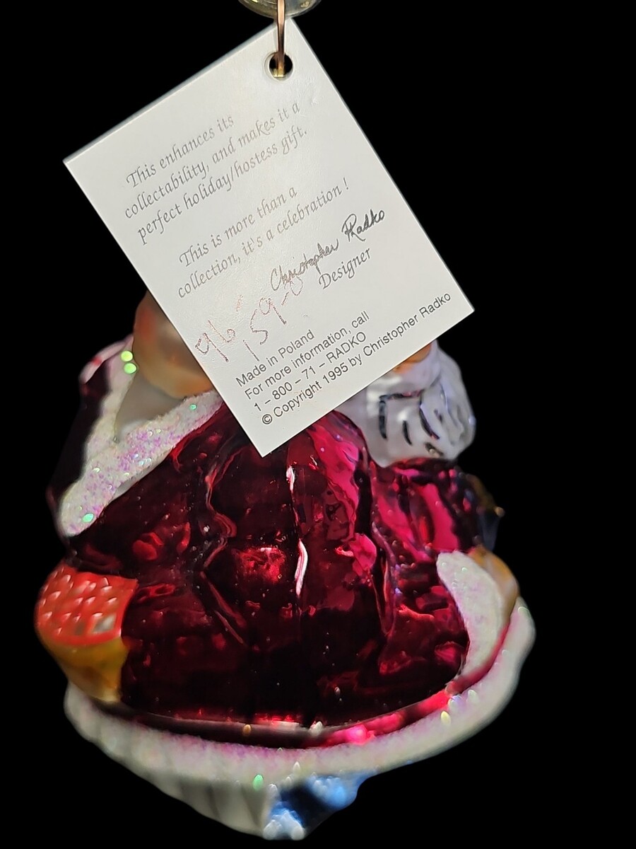 These estate-fresh ornaments are highly collectible and feature Radko?s signature craftsmanship: vibrant colors, detailed glitter work, and timeless holiday charm.