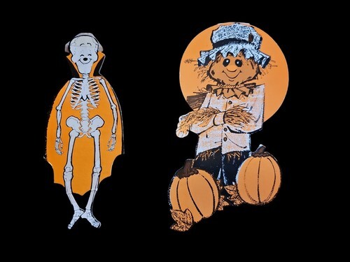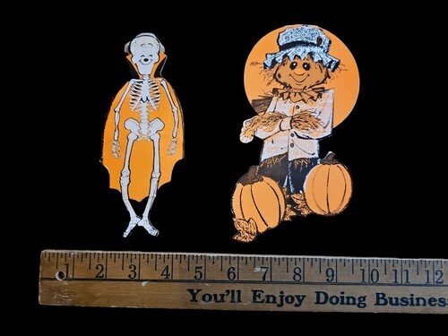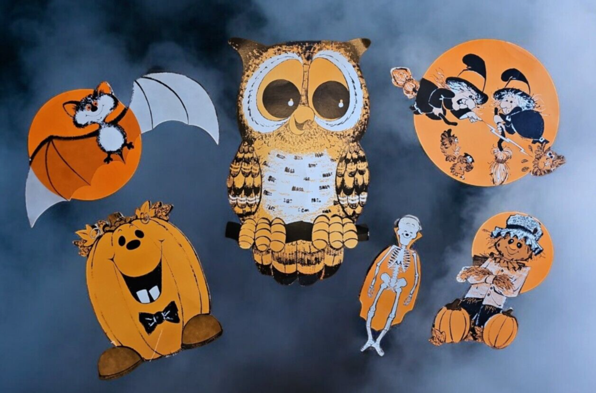 Vintage Halloween 5 Piece Die Cut Set Owl Witch Bat Moon Skeleton Jack-O-Lantern