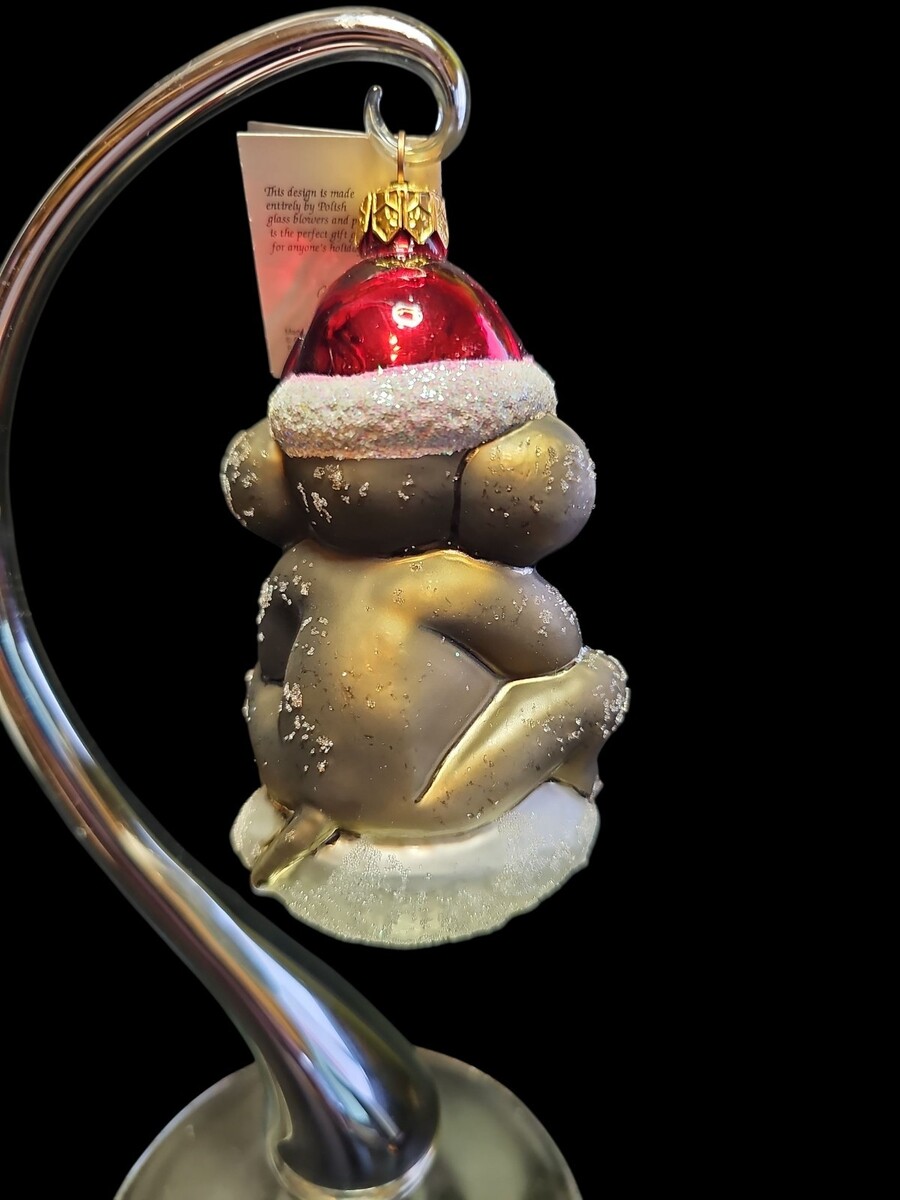 Exclusive Starlight Members-only gift featuring a charming mouse in a Santa hat, clutching a green present. Hand-blown, glittered hand-painted finish, around 4?5? tall. Excellent condition with original tag and box?no chips or cracks noted. Discontinued and rare?great for collectors or as a special thoughtful gift.