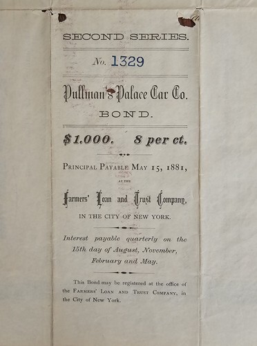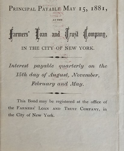 A $1,000 Bond 8 per ct. Principal Payable May 15, 1881, at the Farmers' Loan and Trust Company, In the City of New York. Interest payable quarterly on the 15th day of August, November, February and May. This Bond my be registered at the office of the Farmers' Loan and Trust Company, in the City of New York
