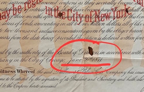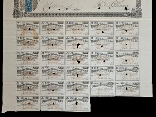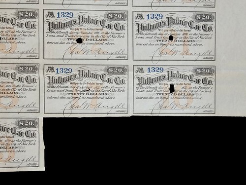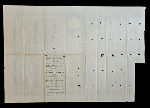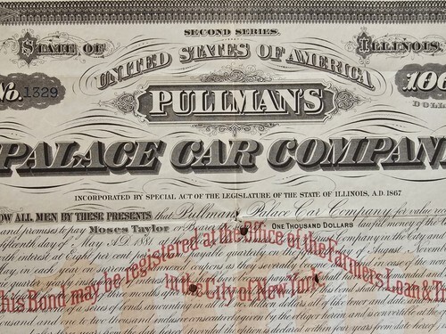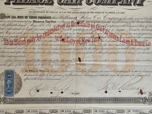 UP FOR SALE: George M. Pullman (1831-1897), Inventor, Industrialist. His first Railroad car ?Pioneer,? was enthusiastically received and in 1867 he organized the Pullman Palace Car Co. Pullman?s business ability made it the greatest car building organization in the world. 1871, IL, $1,000 Bond with all but 2 of the coupons. Western Bank Note Engraving Co., Chicago. George M. Pullman autographed bond. Large impressive signature barely touched by the hole cancellations. A Great Bond!!!
