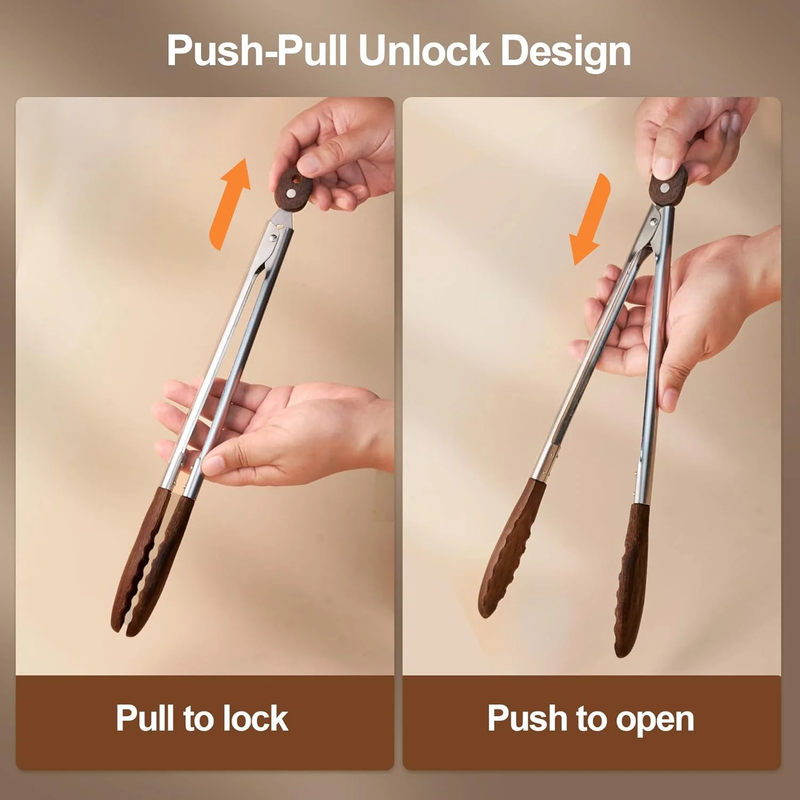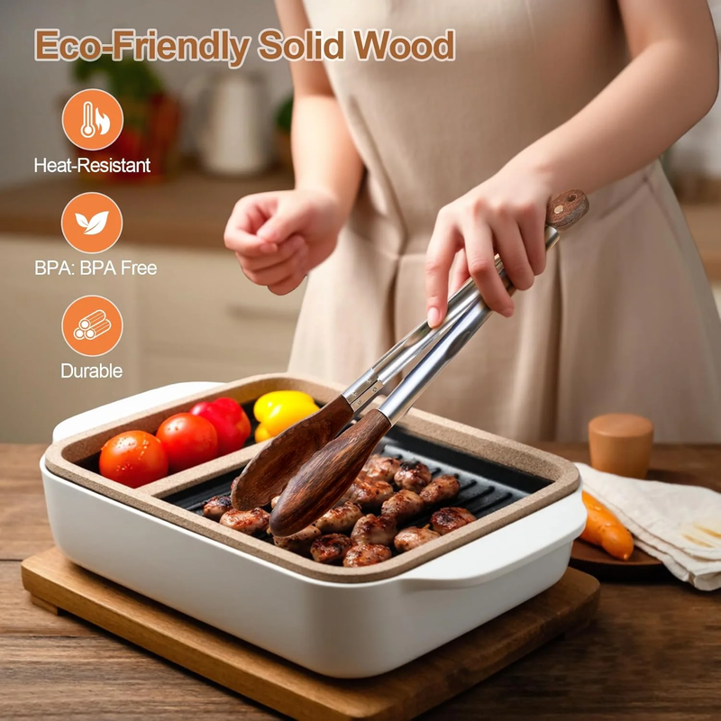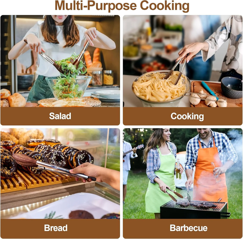 ?NON-TOXIC NATURAL WALNUT WOOD: This wooden tong for cooking is expertly crafted from natural walnut wood, ensuring a non-toxic and safe experience. This serving tong is reinforced with stainless steel, offering the durability needed for all your cooking tong needs. MULTIPLE PURPOSES: Whether you flipping steaks with a grill tong or serving a fresh salad with a salad tong, this tong is your go-to kitchen accessory. This is perfect as a BBQ tong for outdoor grilling or as a salad tong for indoor dining. SCRATCH-RESISTANT: Our tong for serving food come with wooden tips, ensuring this is gentle on all types of cookware. Wood Tongs, ideal for cooking, grilling, BBQ, and tossing salad, they prevent scratches on non-stick surfaces, making them a safe choice for your favorite pots and pans. STRONG GRIP EASY TO CLEAN: This food tong offers a comfortable stainless steel grip and is effortless to clean, adding convenience to your kitchen routine. Practical walnut tong for daily use, fitting well within any kitchen utensils set. IDEAL GIFT FOR COOKING ENTHUSIASTS: This kitchen utensil is beautifully crafted from walnut wood, which gives these wooden utensils an aesthetically pleasing ambiance in any kitchen. These grilling tongs are perfect for loved ones who like to cook, chefs, or even for your personal use.