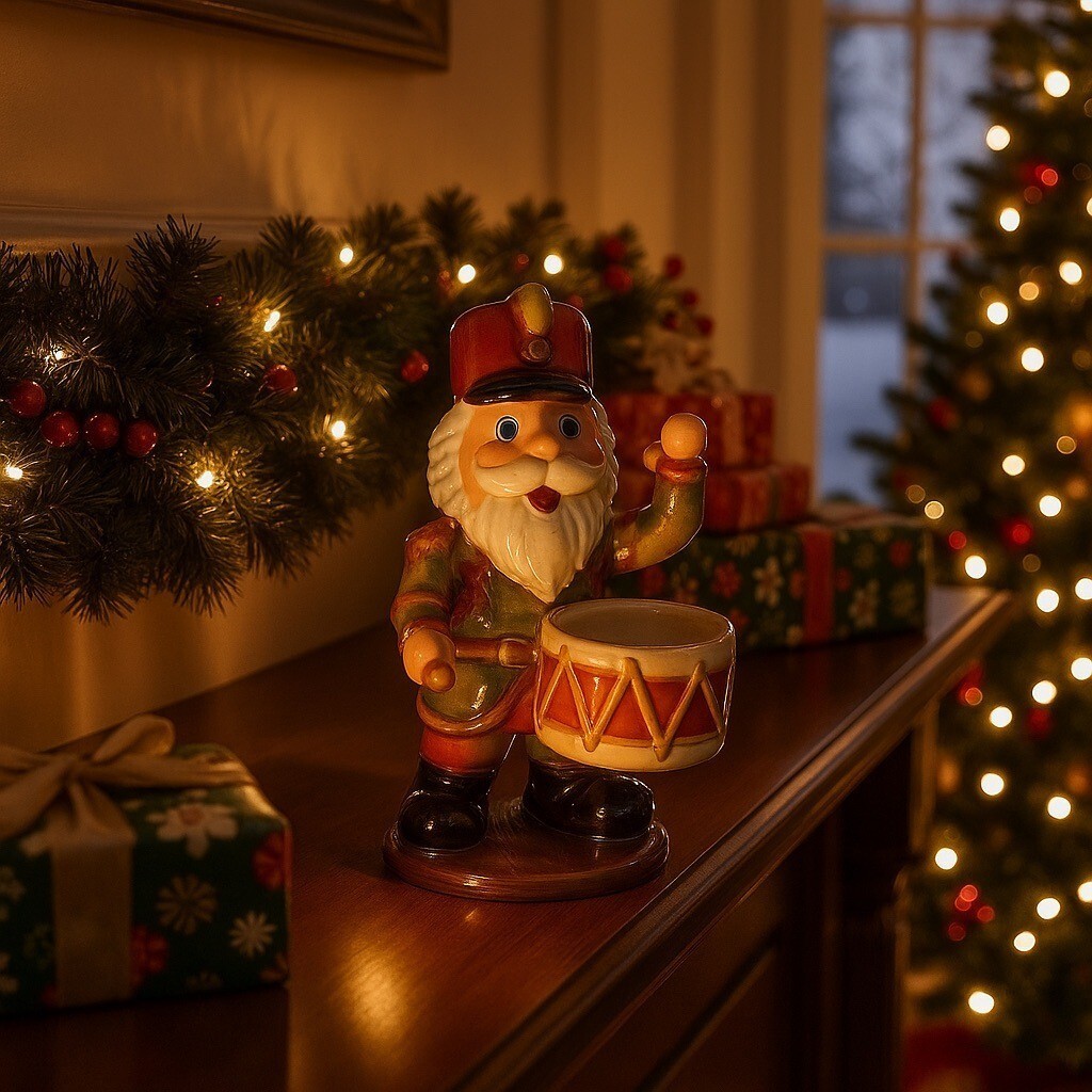 Charming nutcracker figurine holding a drum-style tea light cup. Made exclusively for Yankee Candle and finished in classic holiday colors with glossy glaze accents. A festive addition to Christmas decor.