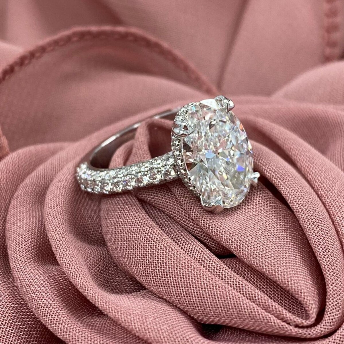 Este clasico anillo de compromiso presenta un increíble diamante cultivado en laboratorio de talla brillante ovalada de 5,02 quilates, certificado por el prestigioso IGI. La forma ovalada del diamante es verdaderamente única y llama la atencion sobre su brillo, convirtiendolo en una pieza central que llama la atencion. Para complementar la piedra central, 2,07 quilates de diamantes redondos cultivados en laboratorio se colocan meticulosamente en un halo oculto a lo largo de la banda, elevando el diseño a otro nivel de elegancia y sofisticacion. El engaste de los diamantes en oro blanco de 14k proporciona un acabado elegante y atemporal, lo que garantiza que este anillo siempre permanecera a la moda y nunca pasara de moda.