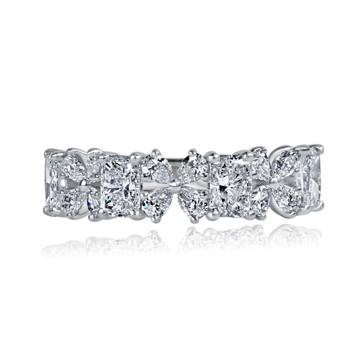 Cette superbe alliance met en valeur des diamants de laboratoire taille brillant poire astucieusement disposes dans un delicat motif floral a quatre petales, accentues par des diamants de laboratoire taille radiant pour plus sparkle et d'elegance. Fabriquee dans un luxueux or blanc 14 carats, cette bague allie magnifiquement un design intemporel a un savoir-faire moderne, ce qui en fait un symbole parfait d'amour et d'engagement. Le poids total en carats est de 2,00 carats.
