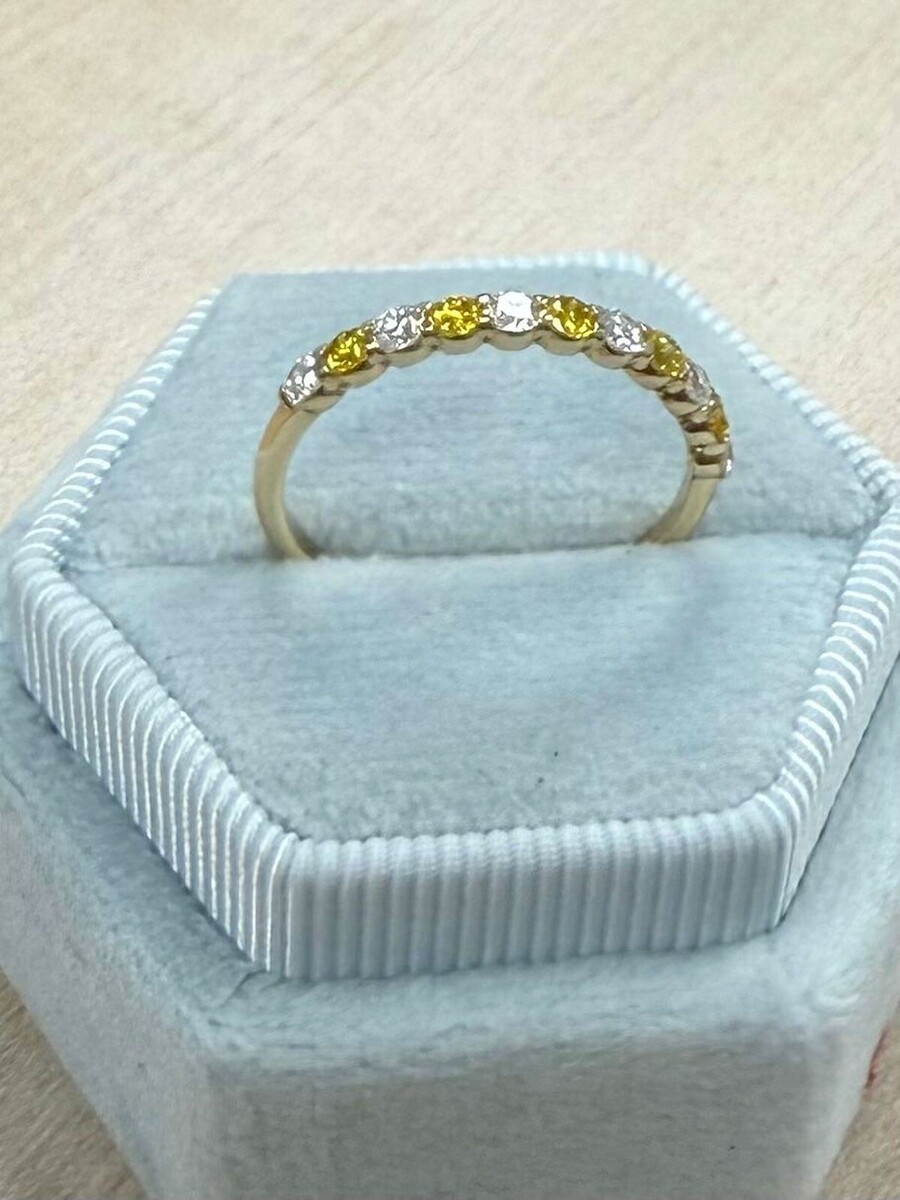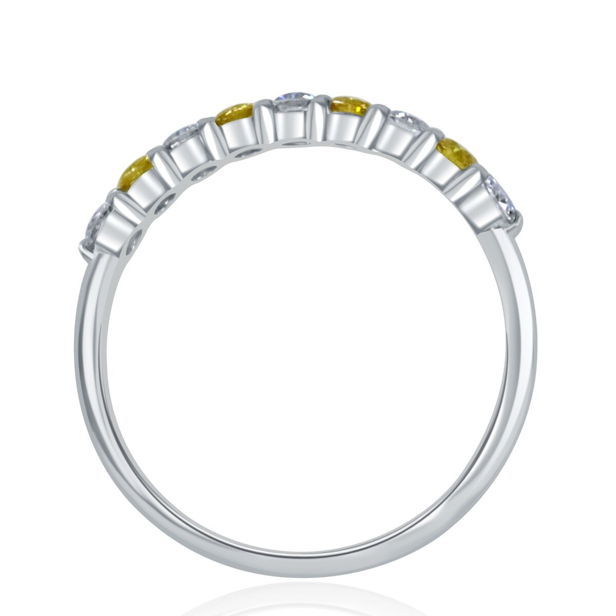 Questa splendida fede nuziale da 0,50 carati presenta un design alternato, che fonde perfettamente la brillantezza dei diamanti incolori coltivati ??in laboratorio con taglio brillante rotondo con il fascino dei diamanti coltivati ??in laboratorio di colore giallo, il tutto elegantemente incastonato in un brillante oro giallo 14k. Festeggia la vostra unione con questa incantevole fede nuziale, pensata per essere unica e straordinaria come la vostra storia d'amore!!