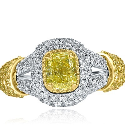 Questo classico anello di fidanzamento con diamanti e dettagliato alla perfezione, presenta un diamante a taglio brillante giallo da 0,72 carati certificato GIA. La pietra centrale e completata da un doppio alone di diamanti tagli rotondi incolori e gialli. Un design a gambo diviso con diamanti scintillanti completa l'aspetto glamour di questo anello. Realizzato a mano in oro a due toni 18K. Il peso totale dei carati e di 1,48 carati.