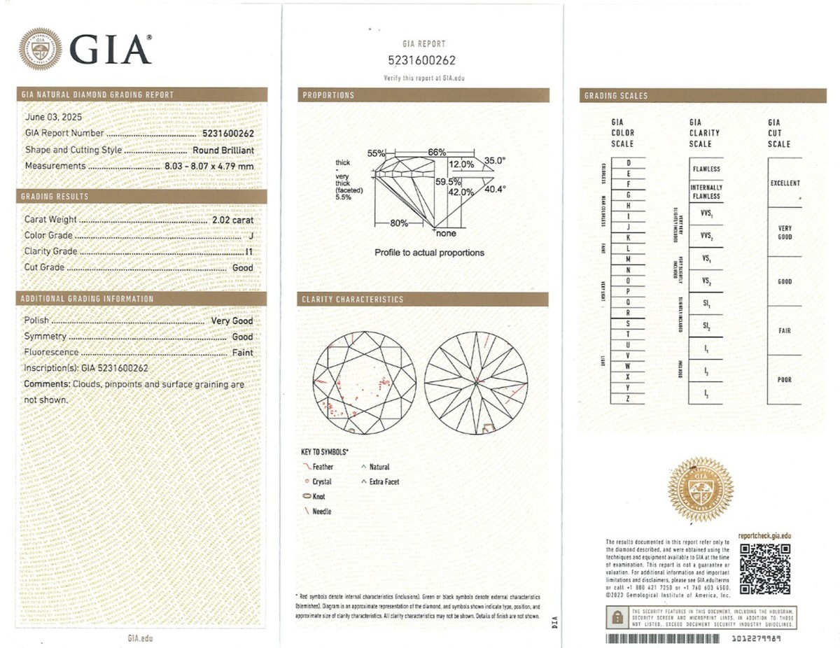 L'anello viene fornito con il certificato del Gemological Institute of America (GIA) n. 5231600262