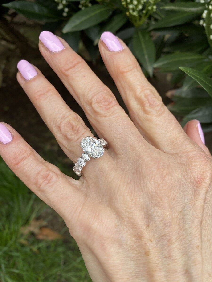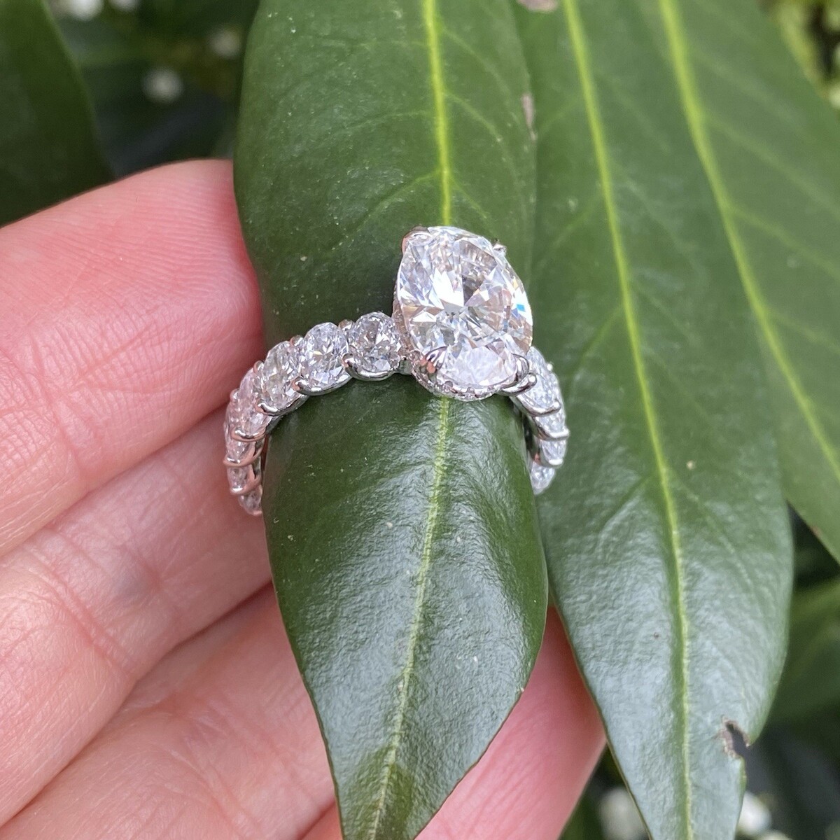 Questo e un gioiello: un anello di eternita con un diamante coltivato a laboratorio a taglio ovale IGI con specifiche di 3,01 carati, grado di colore E e grado di chiarezza VS1. Circondato da 0,30 carati rotondi e 2,87 carati ovali brillanti laboratorio coltivati. L'anello e impostato in oro bianco 18k e ha un peso totale di carati (TCW) di 6,18 carati.
