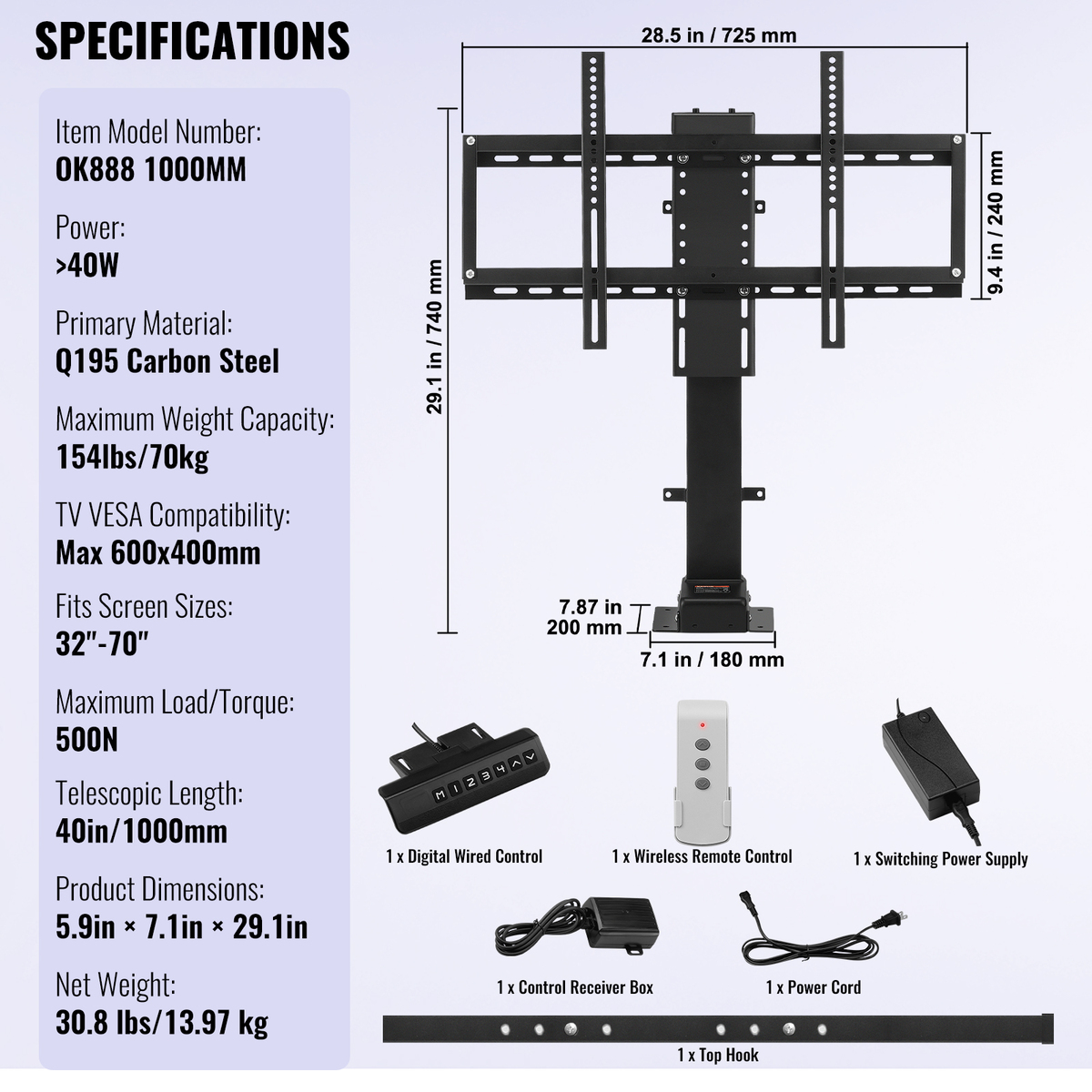 ?AUTO LIFT/DOWN HEIGHT?- This product supports 4-level hook adjustment. The TV screen can be quickly lifted or down between 28.7" to 64.2" height at the speed of 30 mm/s(the fastest on the market). Powerful 1000 N motor to keep the up down movement safely. Note: Not suitable for ceiling-mounted or wall-mounted installation, as it may cause product damage.