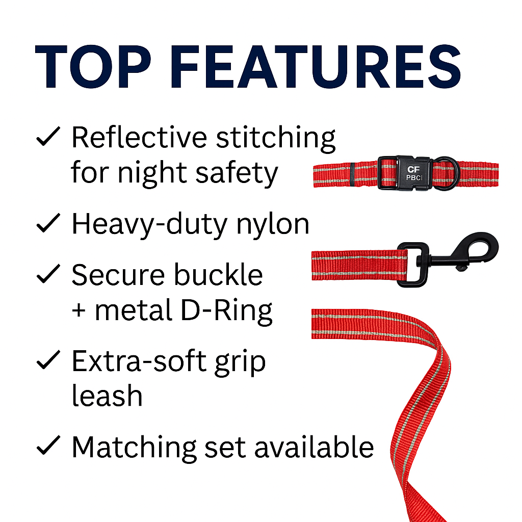Both pieces are made from durable, high-quality reflective nylon that helps drivers and cyclists see you in low light and at night. Strong metal hardware and sturdy construction are designed for everyday use with small, medium, and large dogs.