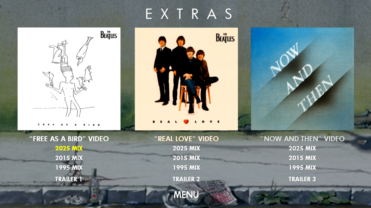 This fan-made three-disc Blu-ray set includes the entire remastered series in HD with stunning 5.1 surround audio along with the music videos for "Free As A Bird", "Real Love" and "Now And Then", with each video represented by three different mixes (2025 mixes, 2015 mixes, and the original 1995 mixes) AND trailers for the Anthology series.