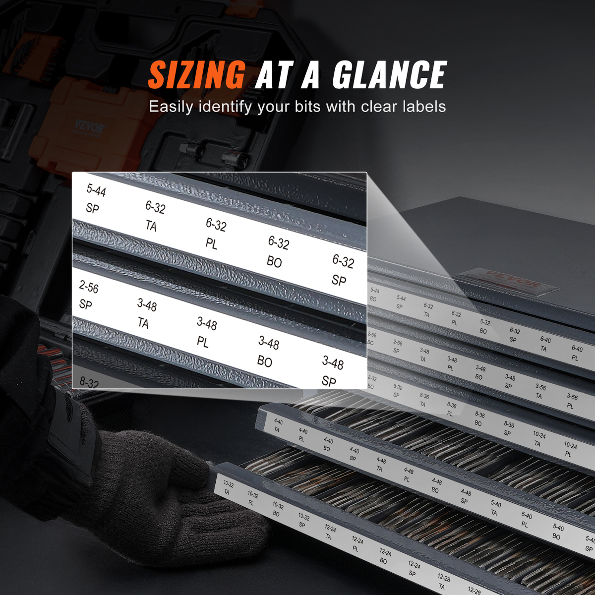 Efficient Storage Organizer: This five-drawer, 60-compartment tap dispenser cabinet effortlessly stores your tap collection. It accommodates taps ranging in size from #2-56 to #12-28 . Labeled compartments allow for quick identification and organization.