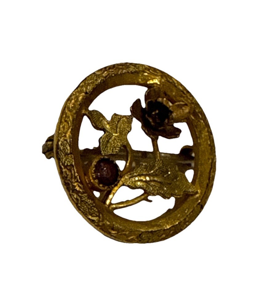 This is made by George L Paine, a jewelry manufacturer based in Massachusetts from 1903-1922. Famously, they signed nothing but their initials, GLP (later GLPCo) because they used steel wire for the pin back and spring. This pin tests as 10k gold. It features a small amethyst stone and another stone, that I?m unsure about. See all photos for details as it is smaller than a U.S. quarter.