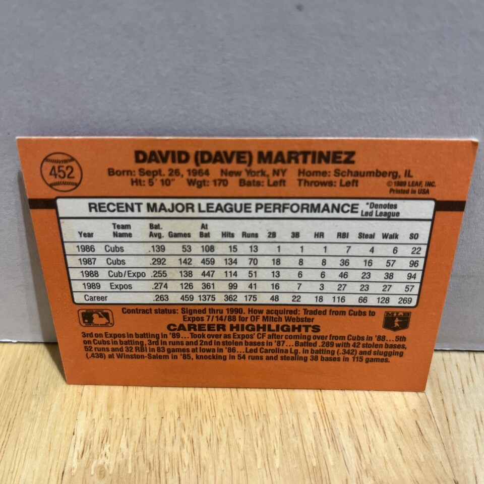 The product is a 1990 Donruss #452 trading card featuring baseball player Dave Martinez from the Montreal Expos. This sports trading card is part of a set manufactured by Donruss in 1990, depicting the player in his MLB uniform. The card is not autographed but is considered to be in good condition for collectors interested in vintage baseball cards.
