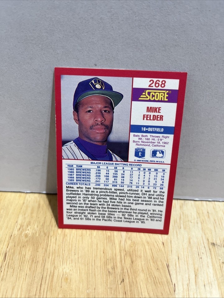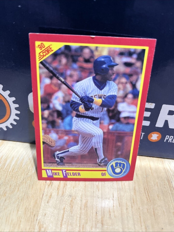 The product is a 1990 Baseball Score trading card featuring Mike Felder of the Milwaukee Brewers. This vintage card is part of the Score set manufactured by SCORE for MLB baseball fans. The card is not autographed and is a single trading card from that specific year and season. Perfect for collectors of sports memorabilia and fans of the Milwaukee Brewers team, this card captures a piece of baseball history from the 1990 season.