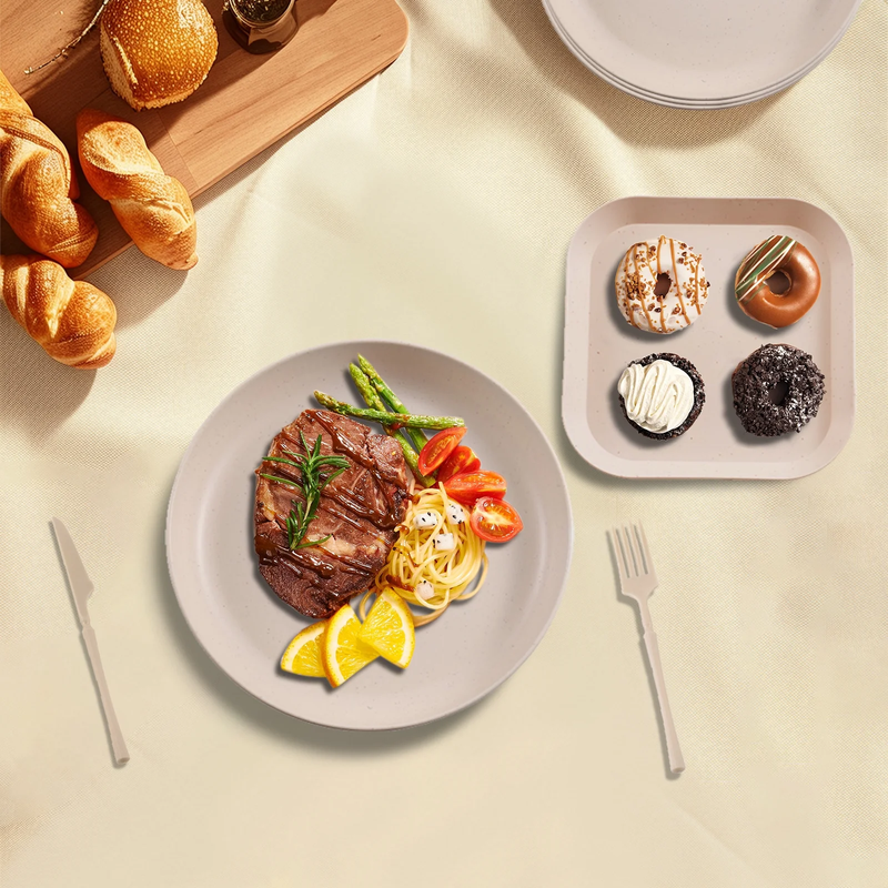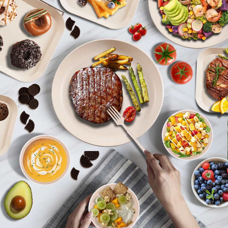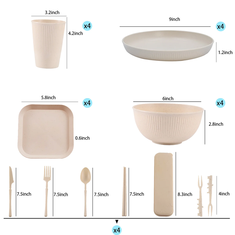 Before use: The wheat straw tableware can only be placed in a cold air dishwasher. Dishwashers with heating functions may cause the tableware to deform. The microwave oven should be used below 420? and the heating time should not exceed three minutes! ?Value Pack?Soulgenix wheat straw dinnerware set includes 4 dinner plates, 4 dessert plates, 4 bowls, 4 cups, 4 cutlery sets, and 8 fruit forks, providing everything you need for family meals or gatherings. ?Microwave and Dishwasher Safe? The Wheat Straw Sets is safe for use in the microwave, freezer, and dishwasher, with heat resistance up to 212F (100C), ensuring quick reheating and effortless cleaning. ?Versatile for All Occasions? This dinnerware set is perfectly suited for family gatherings, picnics or camping trips, making it ideal for both home use and outdoor activities, with exceptional practicality. ?Compact and Reasonable Storage? The wheat straw dinnerware sets can be stacked and stored in an orderly manner, which can be easily stored in the kitchen, dormitory, rv or camping. It not only saves space, but also enables easy storage. Help you stay organized and enjoy convenience! ?Recyclable Unbreakable? This 48-piece dinnerware sets is sustainable alternative practical and stylish. The kitchen plates and bowls set is very healthy dinnerware set for your family, sustainable and unbreakable, making it perfect for families