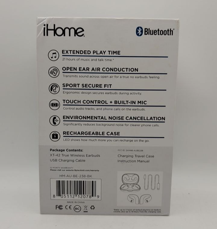 Item includes: Please note: This item includes 1x iHome XT-42 True Wireless Earbuds, 1x USB Charging cable Only ? As Pictured. No other accessories are included.