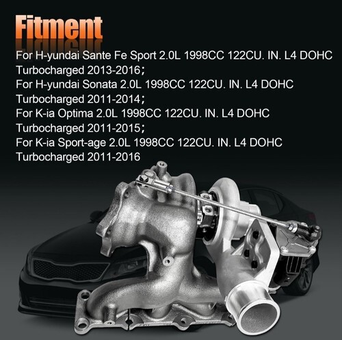 Vehicle Fitment]:Compatible with H-yundai Sante Fe Sport 2.0L 1998CC 122CU. IN. L4 DOHC Turbocharged 2013-2016? for H-yundai Sonata 2.0L 1998CC 122CU. IN. L4 DOHC Turbocharged 2011-2014? for K-ia Optima 2.0L 1998CC 122CU. IN. L4 DOHC Turbocharged 2011-2015? for K-ia Sport-age 2.0L 1998CC 122CU. IN. L4 DOHC Turbocharged 2011-2016