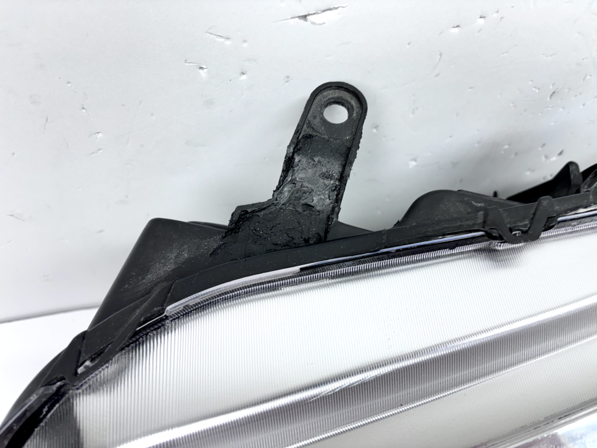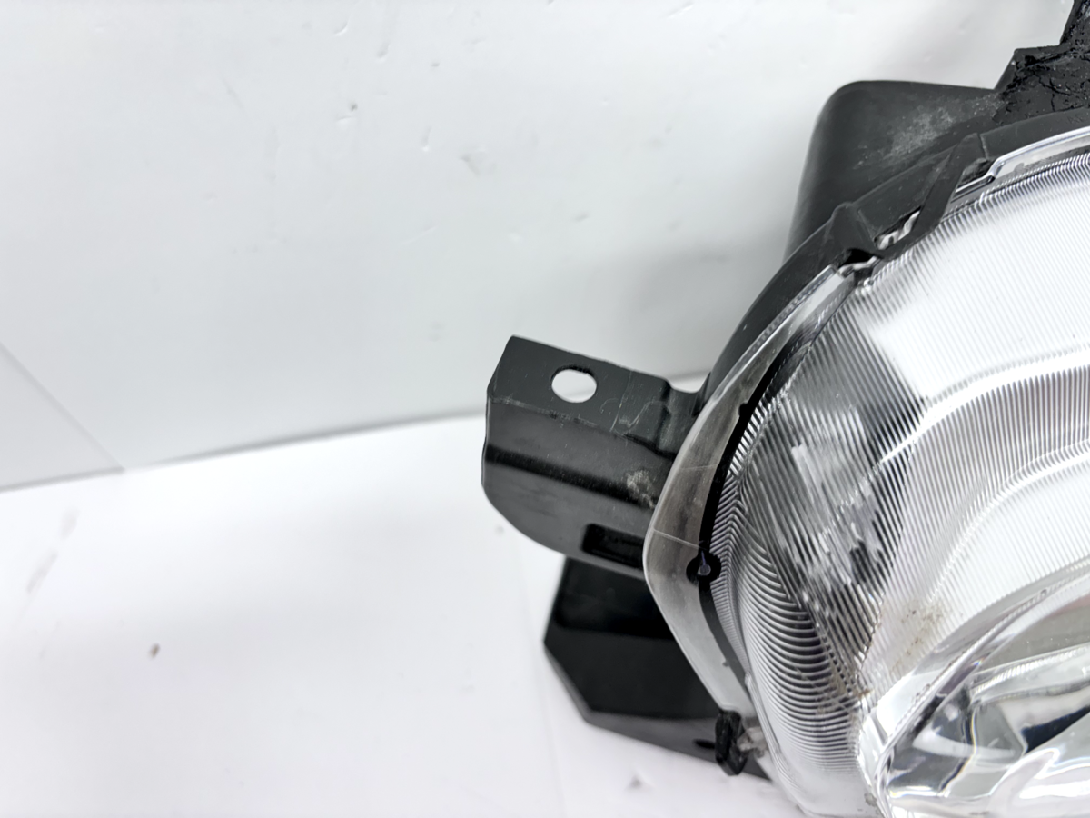 Condition notes include a hazy lens with minor stress marks, reflecting its used condition. The top tab has been repaired. The housing is black with a clear lens and halogen lighting technology. This item is sold as a used part and may show typical wear and cosmetic imperfections consistent with prior use.