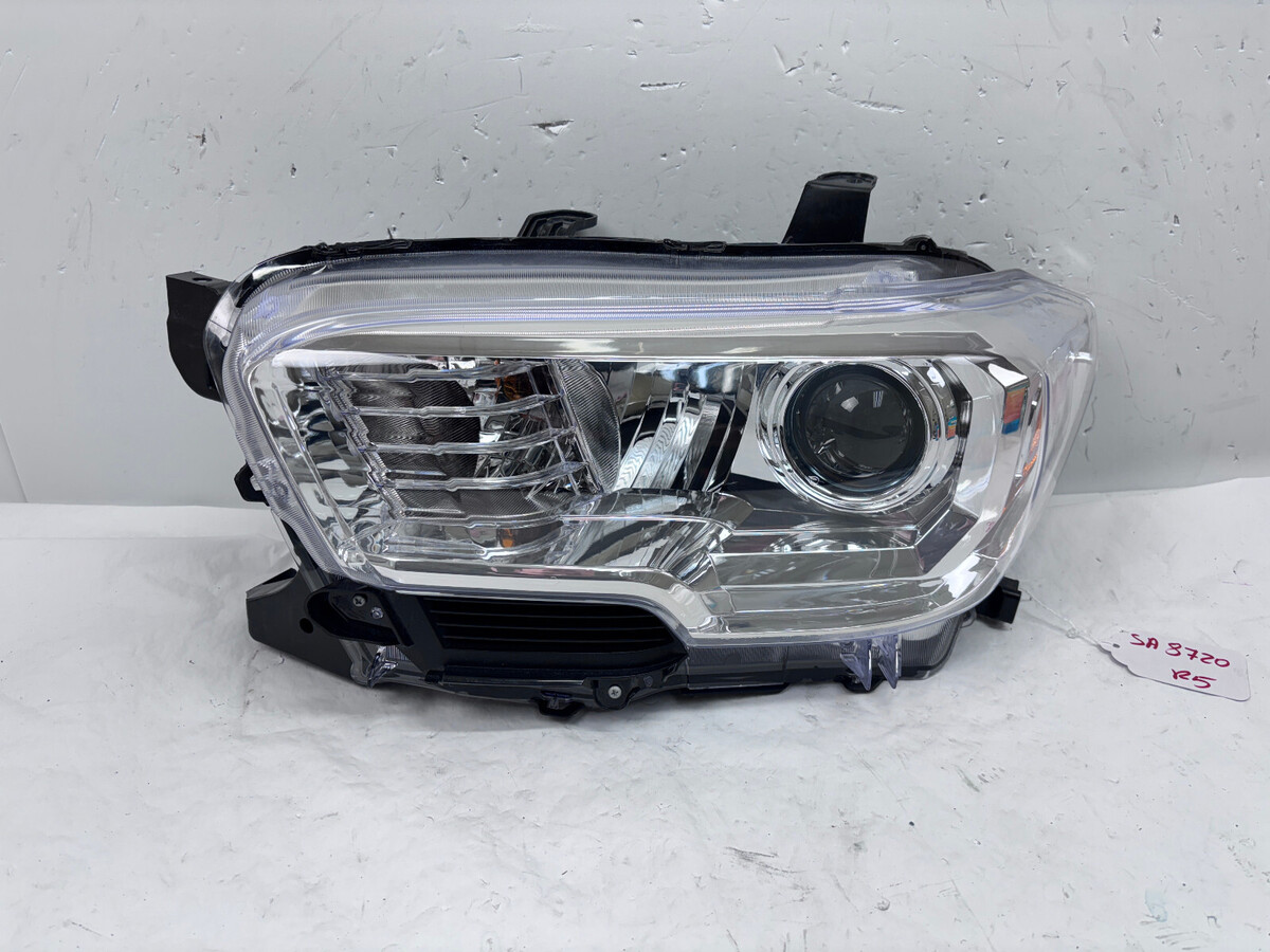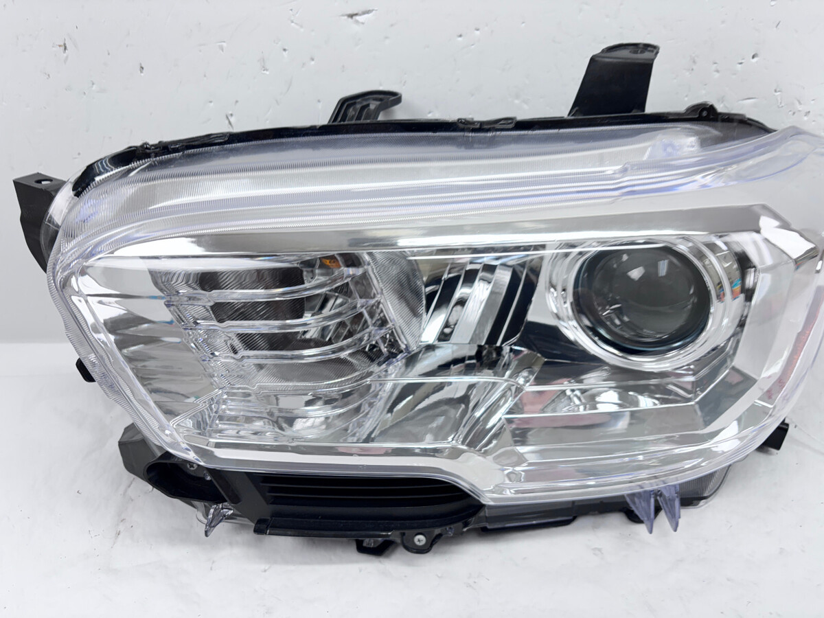 Toyota Tacoma Front Left Halogen Headlight Assembly -- Used, CAPA-Certified. Fits 2016-2022 Tacoma, Driver Side Front. Black housing, Clear lens, with mounting tabs. OEM-style replacement part. Ships FedEx Ground in 48 states; Global Shipping available.