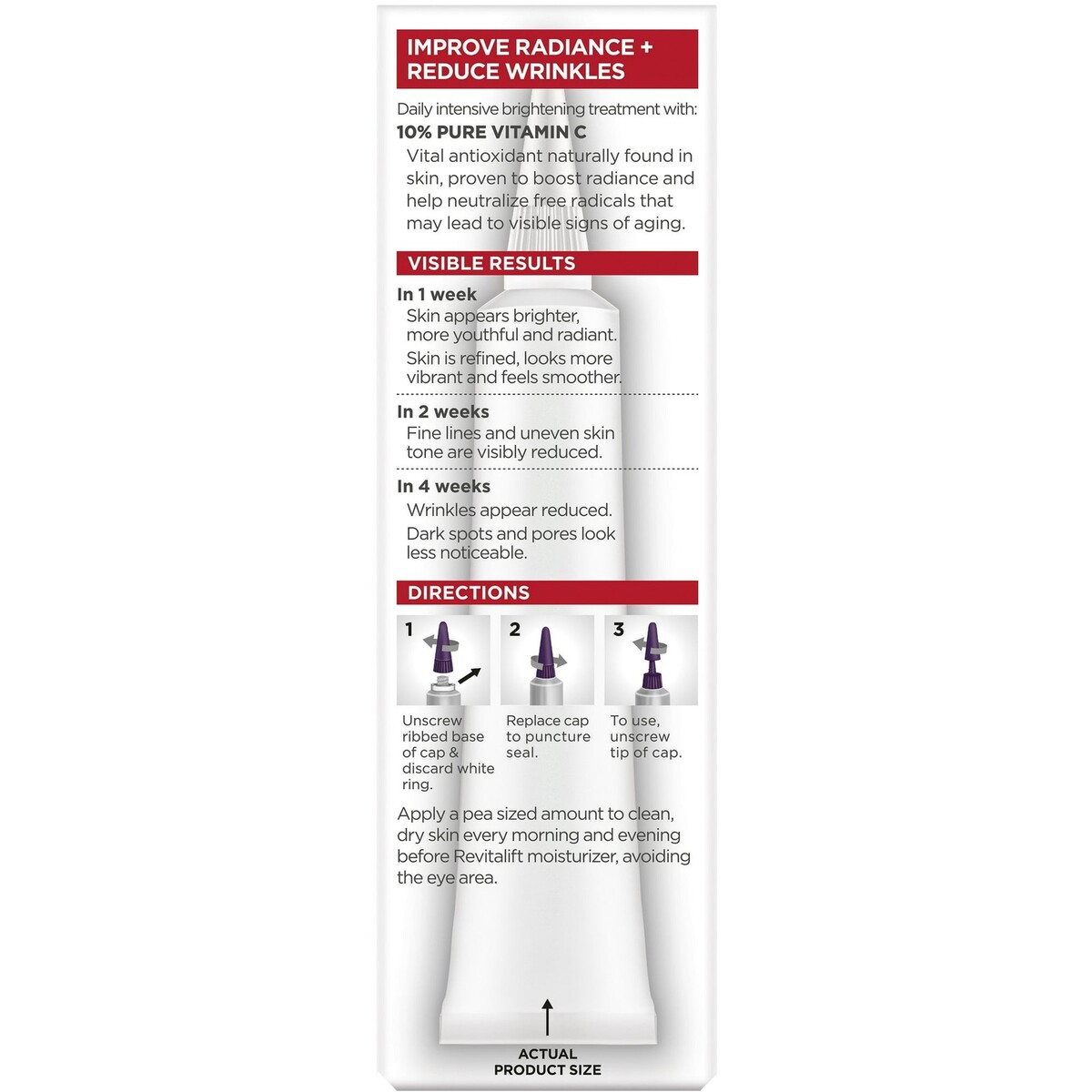 L'Oreal Paris Revitalift Derm Intensives 10 Percent Pure Vitamin C Serum, Paraben Free, 1 fl ozL'Oreal Paris Revitalift Derm Intensives 10% Pure Vitamin C Serum is a potent and dermatologist-validated serum with an optimal concentration of Vitamin C. It visibly brightens skin in 1 week, improves fine lines and uneven tone in 2 weeks, and visibly reduces wrinkles, dark spots and pores in 4 weeks. The serum is fragrance-free, allergy tested, and free of parabens, mineral oils and synthetic dyes.