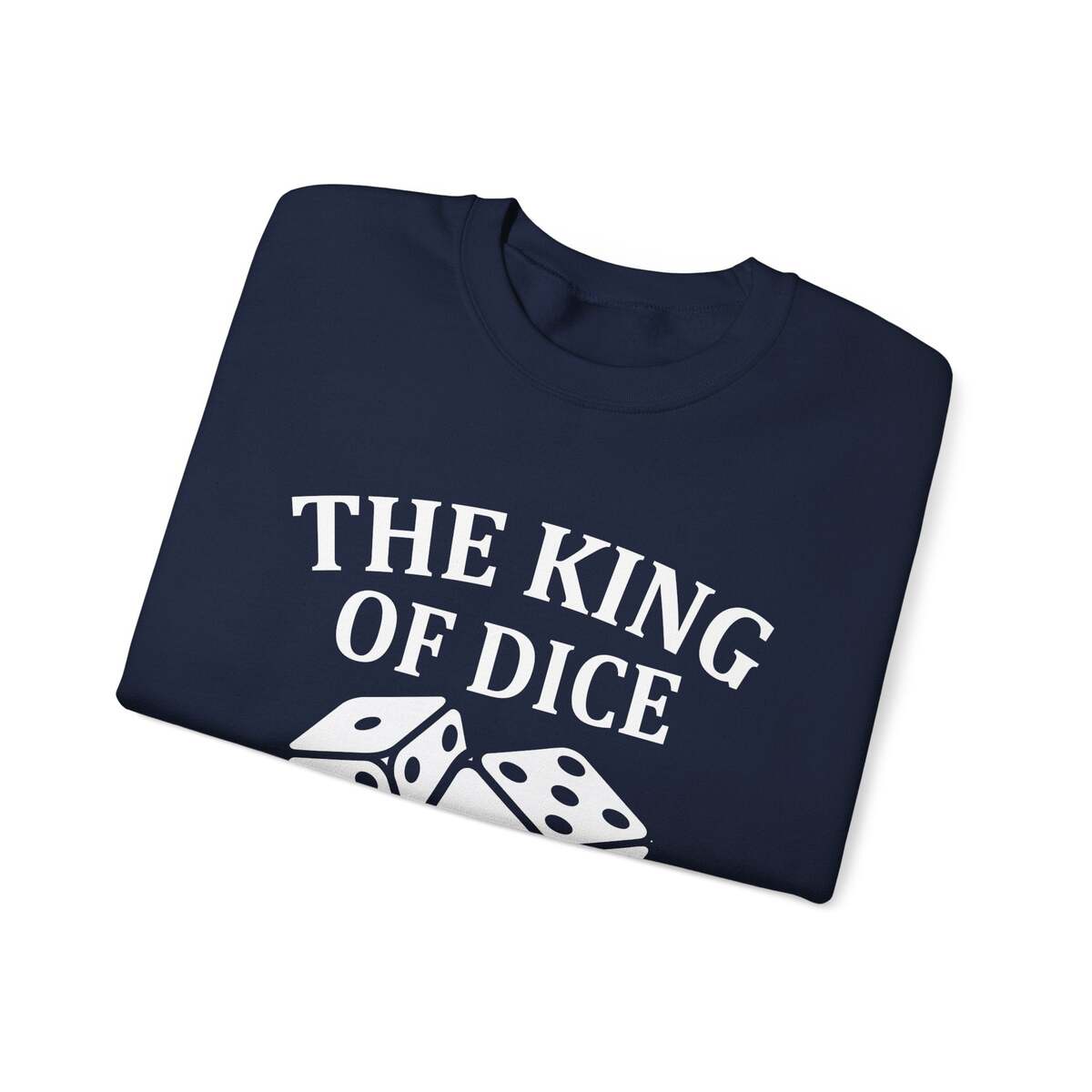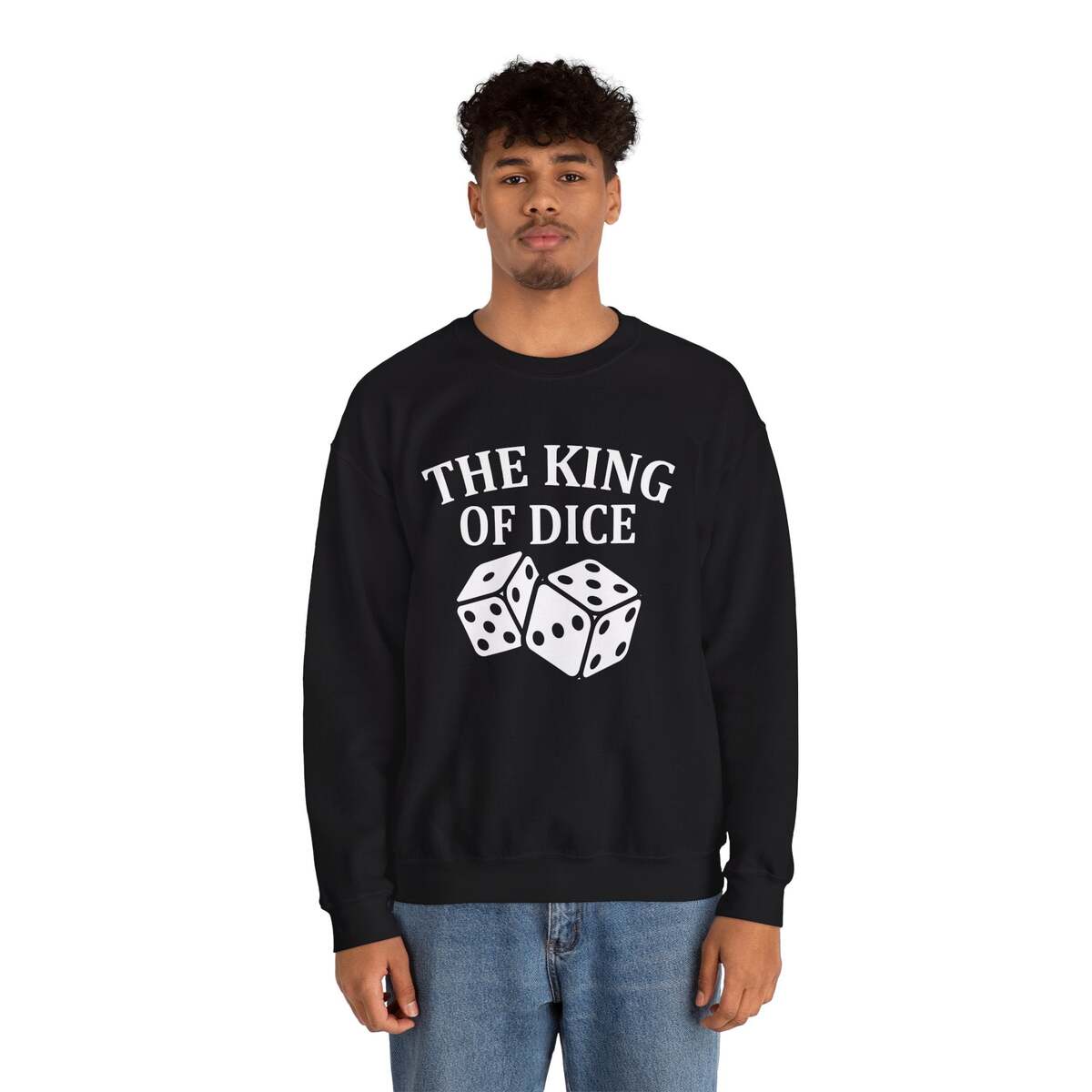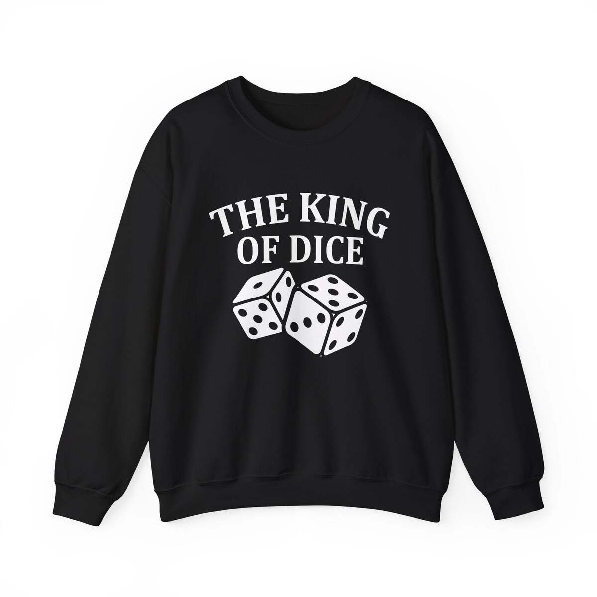 A cozy, midweight crewneck sweatshirt printed with bold, playful dice art and the headline ?THE KING OF DICE.? The soft 50/50 cotton?poly blend feels warm without being bulky, and the classic cut sits comfortably across shoulders for relaxed game-night wear. Subtle details ? ribbed collar, cuffs and waistband, double-needle stitching, and a tear-away label ? keep the feel clean and itch-free. The graphic is produced using DTG for crisp white ink on black, while neck and wrist markings use DTF to stay sharp. Wear it to lean back after a clutch roll, claim bragging rights at the table, or add a touch of gamer personality to everyday outfits.