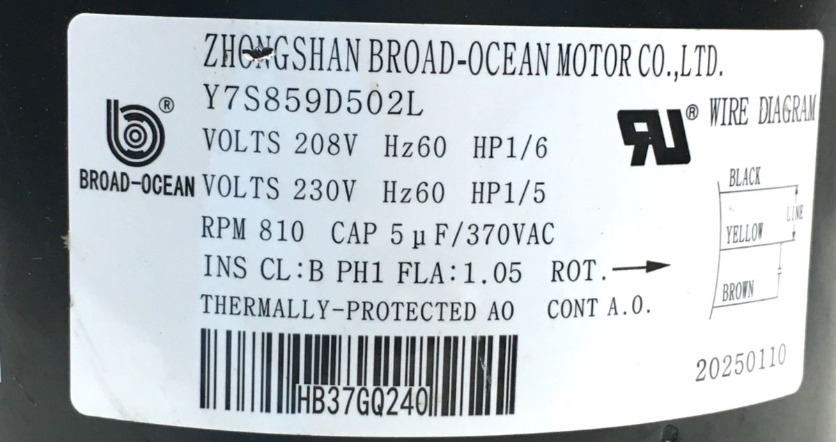 This is Broad-Ocean Y7S859D502L Condenser Motor 1/6 HP 208-230V 810 RPM HB37GQ240 used part.