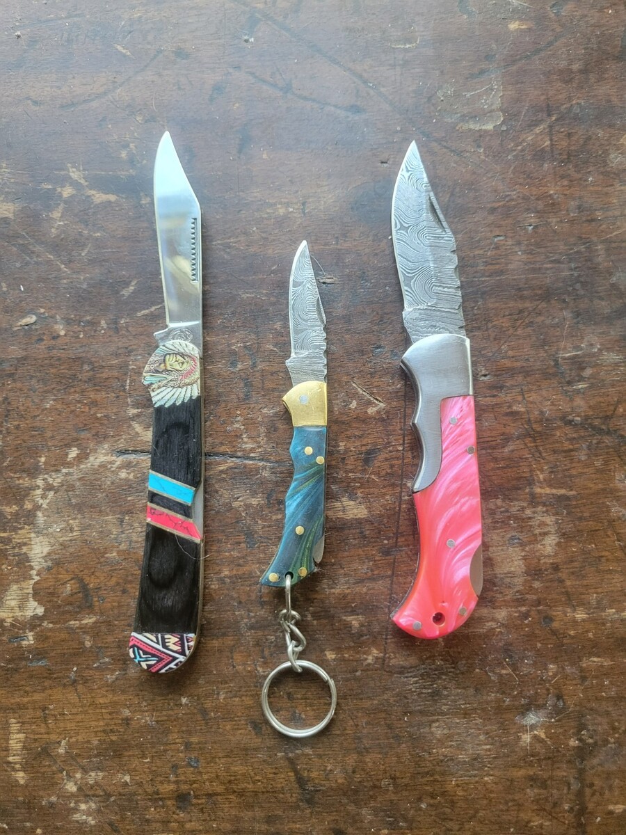 Two Damascus Steel Liner Lock Pocket Knives and One Silver Horse Pocket Knife
