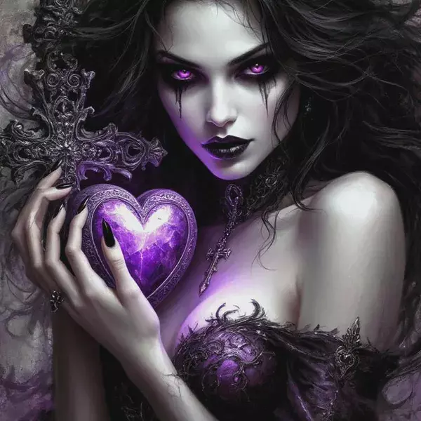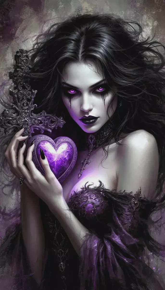 In the quiet of shadowed corners, Anna walks gracefully between light and darkness, a beautiful and mysterious guide for those seeking release from emotional burdens. Her dark hair flows like midnight, framing striking violet eyes that seem to peer into the very depths of your soul. In her hands, she cradles a violet heart, glowing softly with transformative energy, and a cross, a symbol of her spiritual authority and ritual mastery.