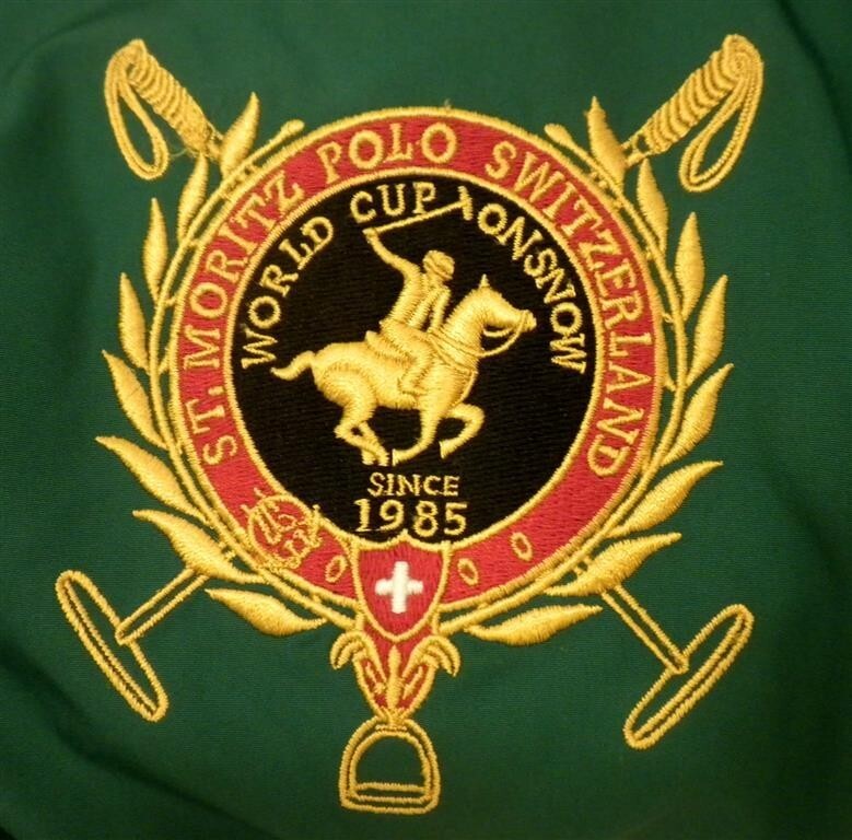 Gold, red and black embroidered "St. Moritz Polo Switzerland World Cup on Snow" on the right side of the chest with crossed polo mallets.