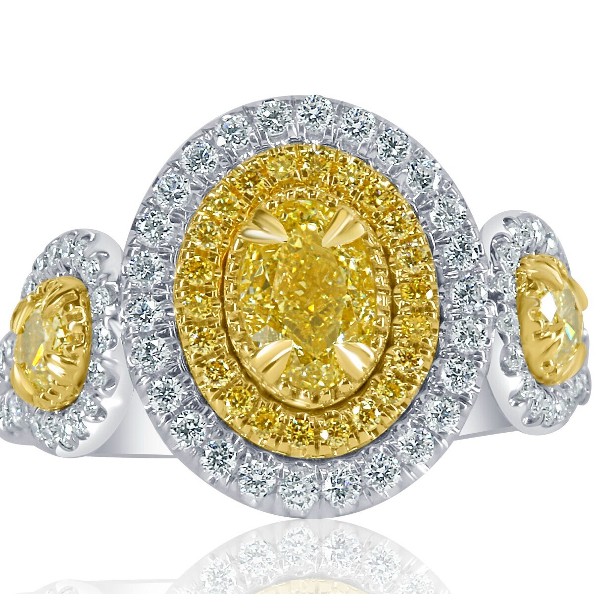 One of the kind engagement ring showcasing a 0.60 carat GIA Certified natural fancy yellow oval brilliant cut center diamond embraced by 2 oval natural fancy yellow side diamonds. The double halo with colorless and yellow round cut diamonds, and a split shank complete a design. Handcrafted in 18-karat multi tone gold. The total carat weight is 1.86 carats.