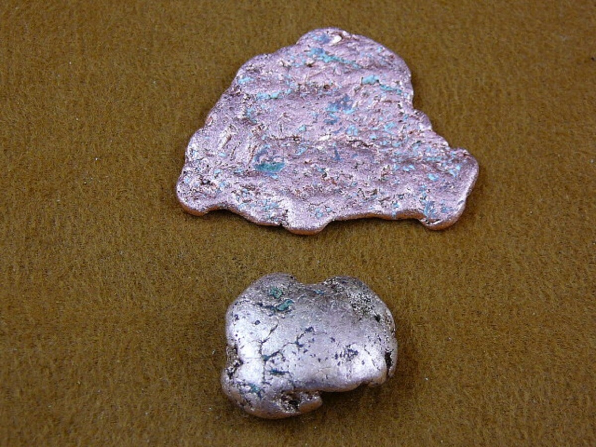 Copper or Cu is a metallic element, which is very conductive. Pure copper is rather soft and malleable, with a pinkish or peachy color. These pure copper freeform specimens are from White Pine Mine, Michigan.
