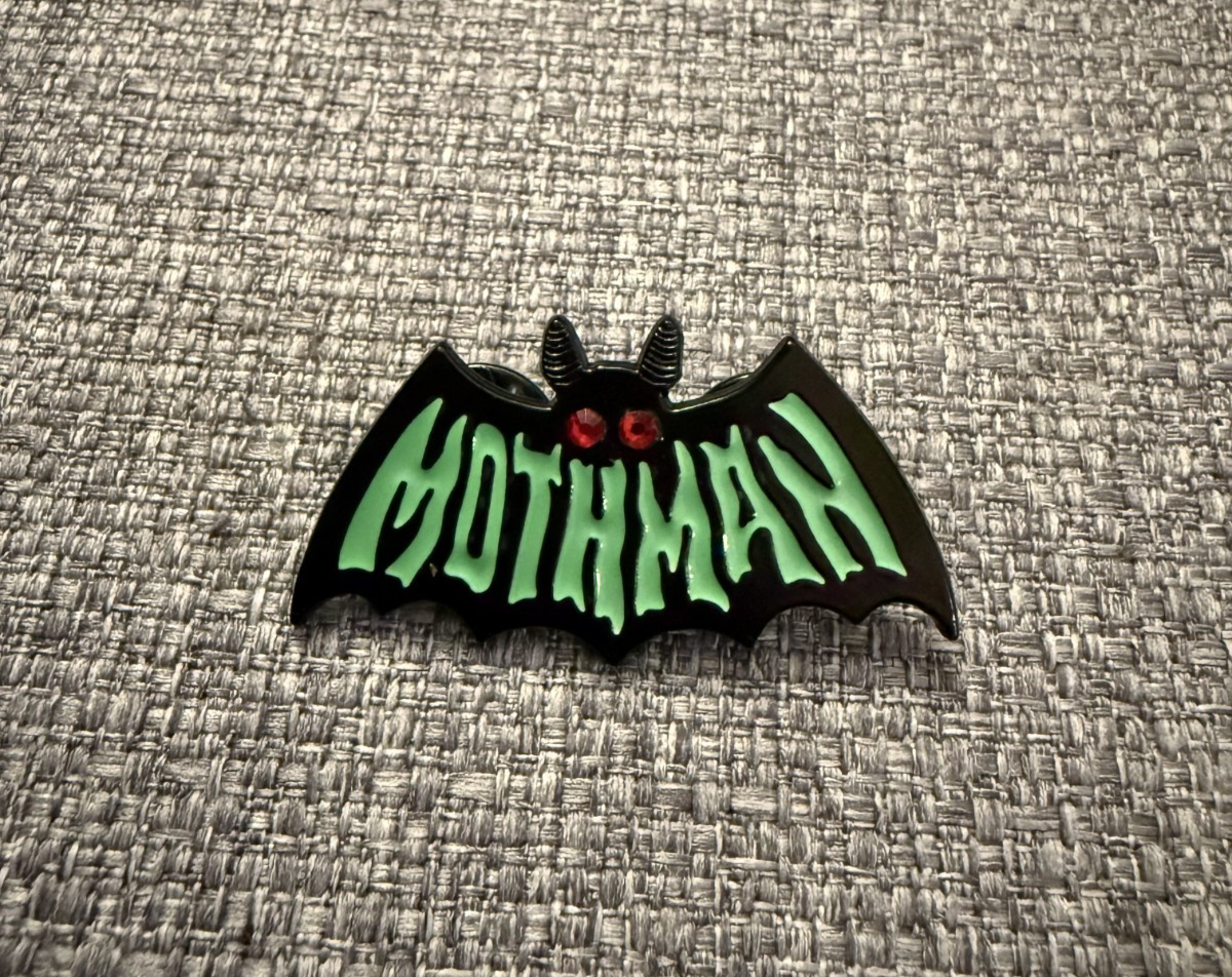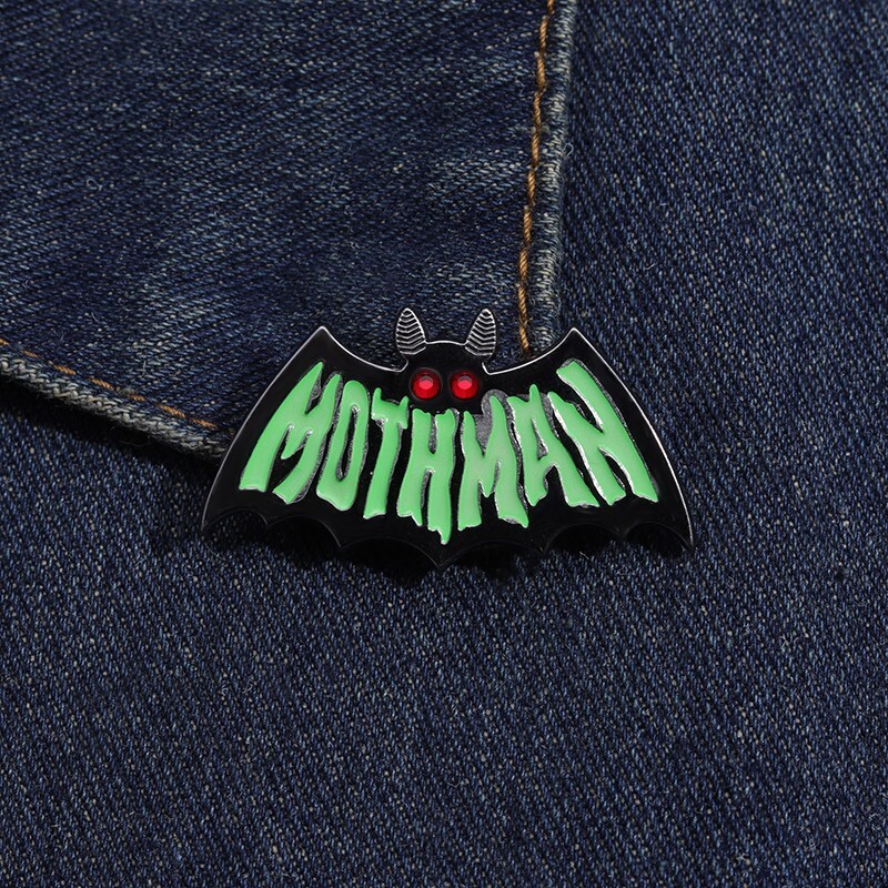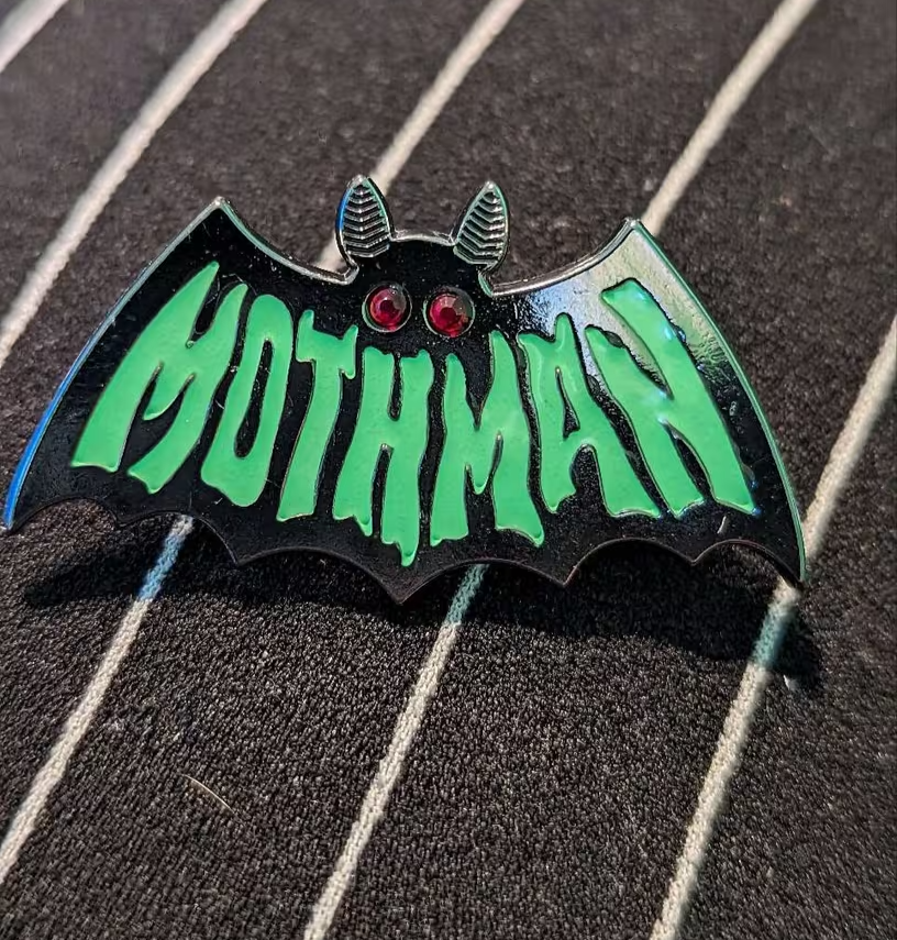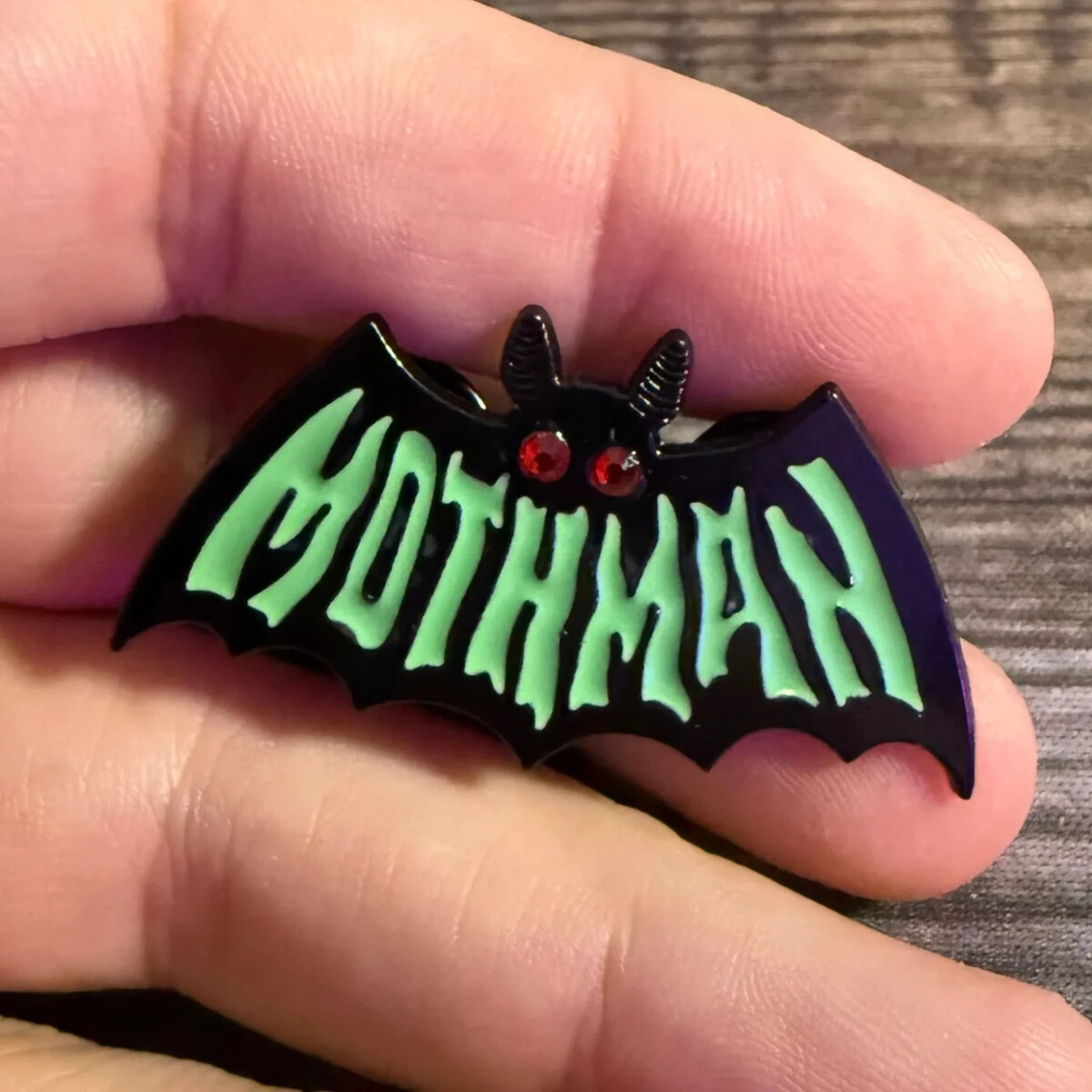 This Mothman enamel pin features bold neon-green lettering, dramatic bat-like wings, and glowing red gem eyes ? a design that screams ?cryptid, but make it fashion.? Inspired by the infamous Point Pleasant legend, this pin is perfect for lovers of cryptids, horror aesthetics, spooky streetwear, and weird collectibles. Whether you believe he?s a harbinger of doom or just a misunderstood night owl with anxiety, this pin is a MUST for pop culture lovers, horror fans, and anyone who enjoys confusing strangers.