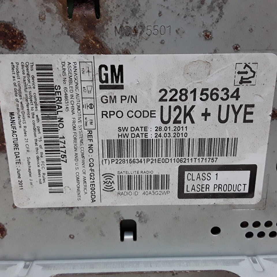2012 Chevrolet and Buick AM/FM XM CD radio receiver. Part number 22815634, these units were used in the Chevrolet Camaro Equinox cruise, Buick regal, LeSabre, and others.