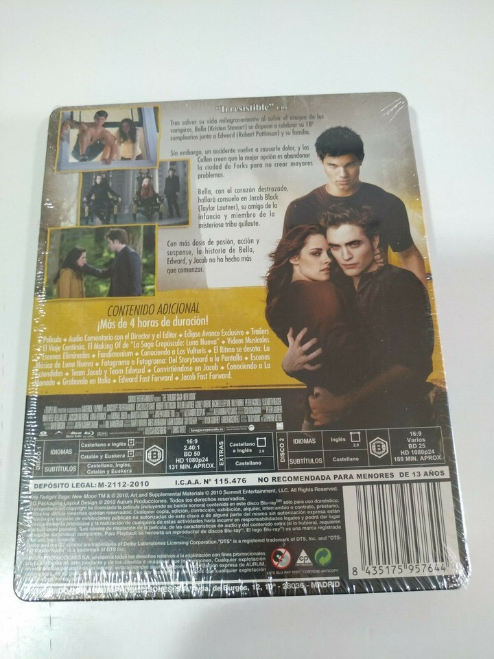 The Next Chapter Begins ?THE TWILIGHT SAGA: NEW MOON? Spanish blu ray STEELBOOK - 2 Disc Edition Horror Vampire CULT - Directed by Chris Weitz (2009) with Robert Pattinson, Kristen Stewart, Taylor Lautner etc. After Bella recovers from the vampire attack that almost claimed her life, she looks to celebrate her birthday with Edward and his family. However, a minor accident during the festivities results in Bella's blood being shed, a sight that proves too intense for the Cullens, who decide to leave the town of Forks, Washington for Bella and Edward's sake. Initially heartbroken, Bella finds a form of comfort in reckless living, as well as an even-closer friendship with Jacob Black. Danger in different forms awaits. Authentic Original spanish blu ray Steelbook ? Official Release in Spain no
