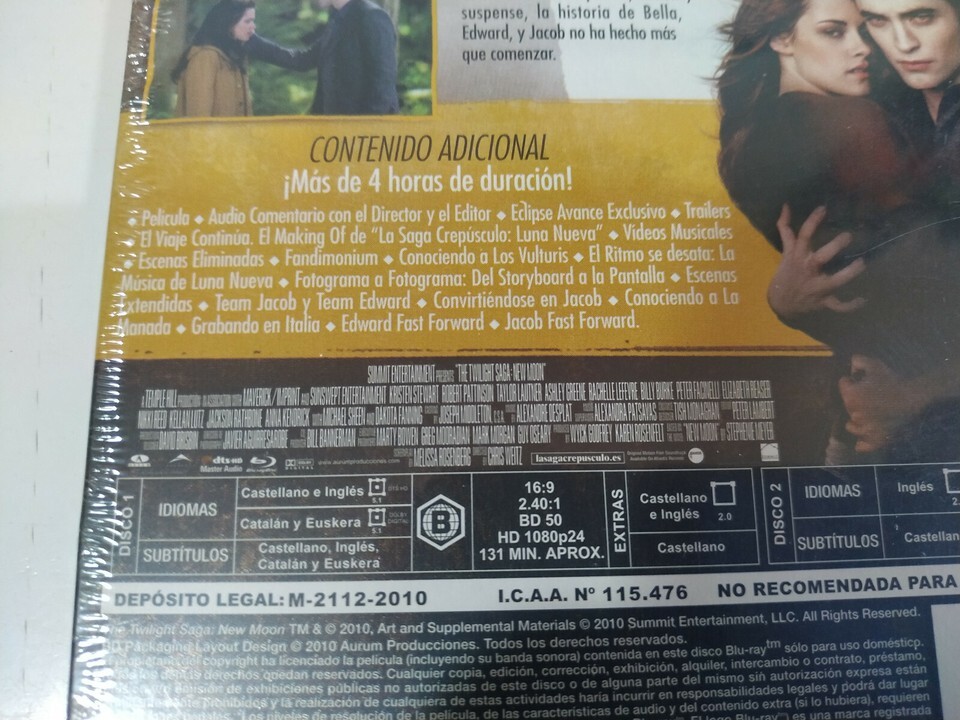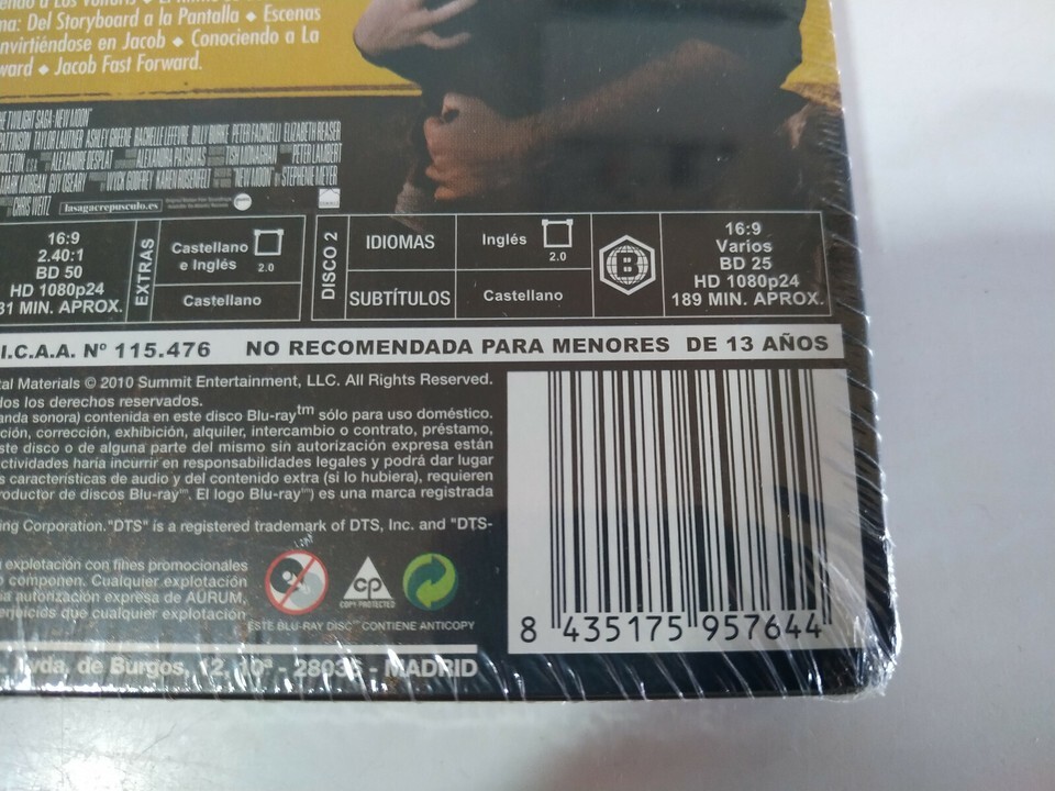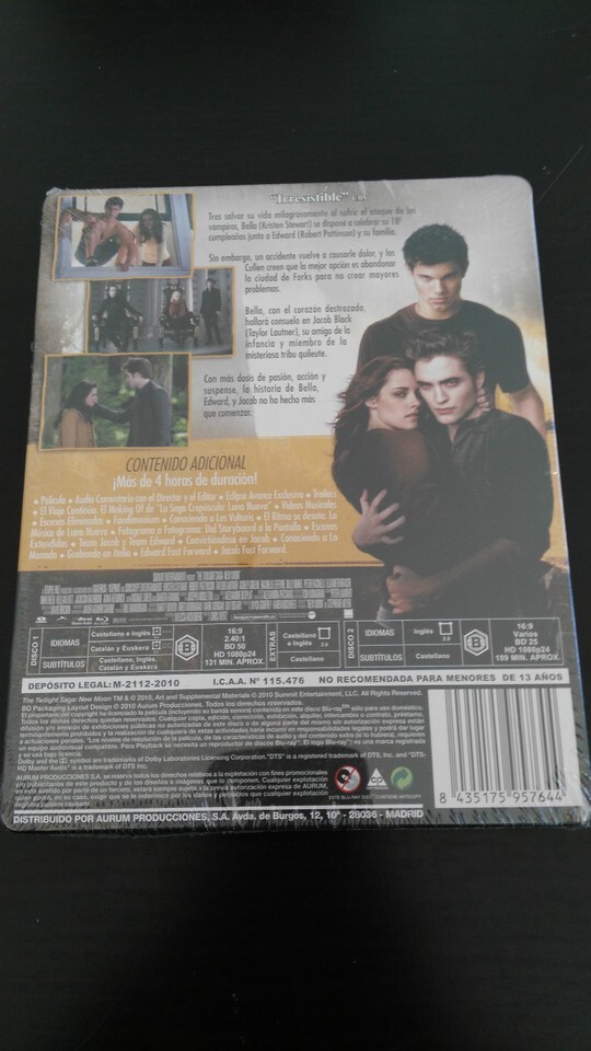 The Next Chapter Begins ?THE TWILIGHT SAGA: NEW MOON? Spanish blu ray STEELBOOK - 2 Disc Edition Horror Vampire CULT - Directed by Chris Weitz (2009) with Robert Pattinson, Kristen Stewart, Taylor Lautner etc. After Bella recovers from the vampire attack that almost claimed her life, she looks to celebrate her birthday with Edward and his family. However, a minor accident during the festivities results in Bella's blood being shed, a sight that proves too intense for the Cullens, who decide to leave the town of Forks, Washington for Bella and Edward's sake. Initially heartbroken, Bella finds a form of comfort in reckless living, as well as an even-closer friendship with Jacob Black. Danger in different forms awaits. Authentic Original spanish blu ray Steelbook ? Official Release in Spain not a bootleg, not a copy or asian release Region B/2 (Disc is running on every European BLU RAY-Player) New and factory sealed Widescreen 2.40:1 ? 1080p x 24 HD Language options: english DTS-HD 5.1, spanish DTS-HD 5.1, catalan 5.1 Subtitles: english, spanish, catalan (Subtitles are optional and removable) Running Time: 131 min. Extras: Featurettes, Making of, Director's Commentary, Trailer etc.